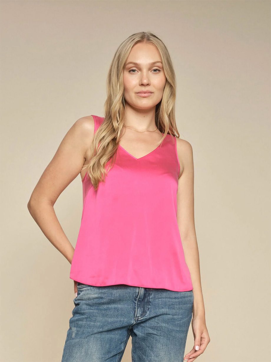This silk tank top is designed in a regular silhouette and feels smooth on the skin. It’s finished with a curved hem that is slightly longer in the back and has a flattering v-neck. This top is feminine and sporty, and we would wear it with classic tailoring, which is the perfect shiny element.