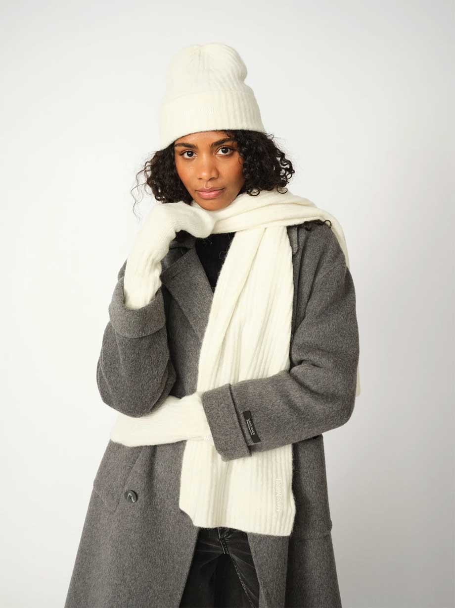 When it gets colder, a knitted scarf becomes an essential accessory. This specific scarf, woven in a two by two rib design from a lightweight blend of alpaca and wool, offers dreamy softness. It’s decorated with a subtle MOS MOSH logo – consider pairing it with our corresponding knitted hat and mittens for a complete look.