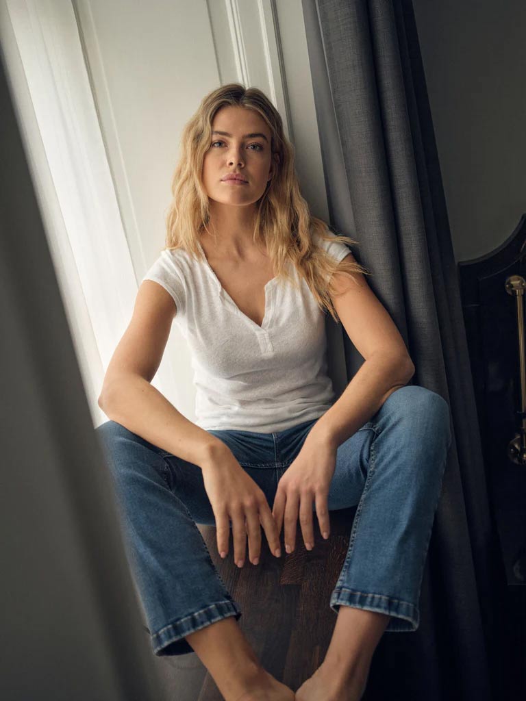 You can always use a well fitted tee in your wardrobe. Cut in slim fit with a feminine placket detail in contrast fabric. We made this in a comfy cotton and linen-blend and added some cool roll up sleeves. You can wear this with anything, but we love it with jeans.