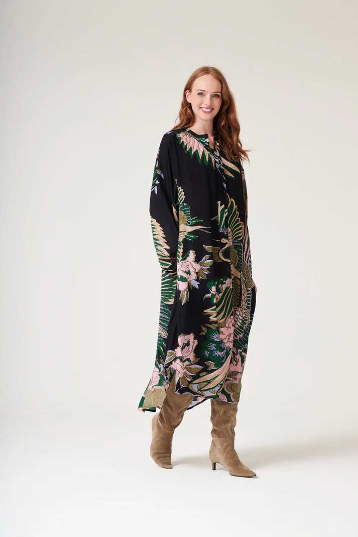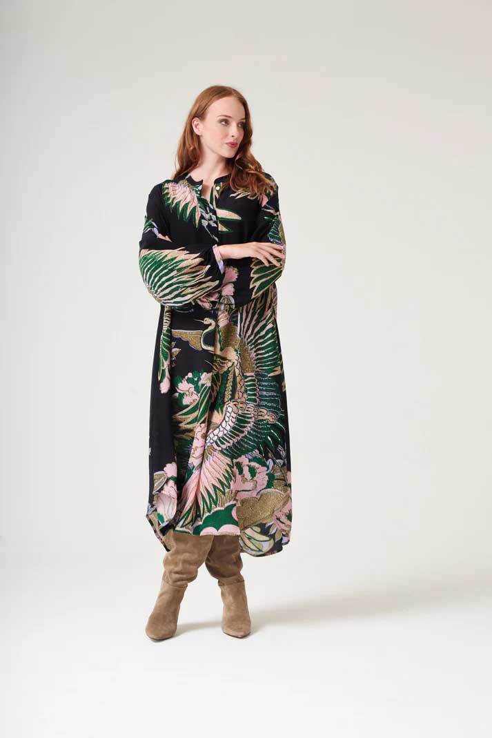 Our crepe Darcy dress features a flattering mandarin collar with a concealed placket front, pockets and loose-fitting balloon sleeves. Our mid-length dress is half lined in organic cotton for ultimate comfort.