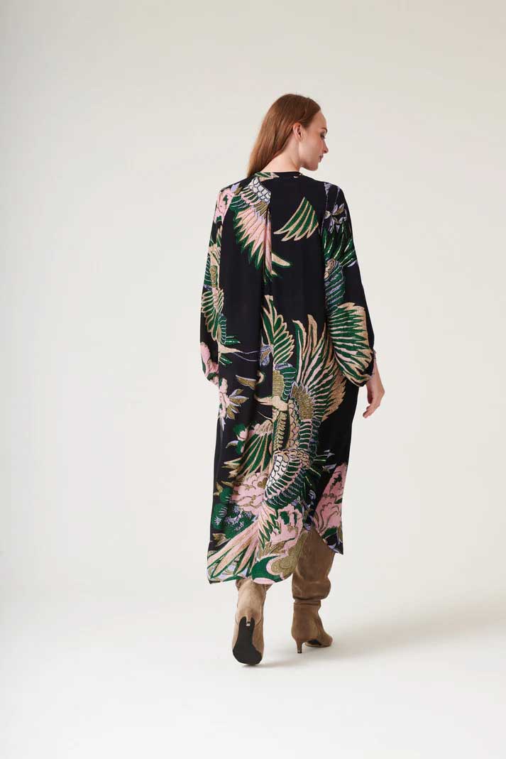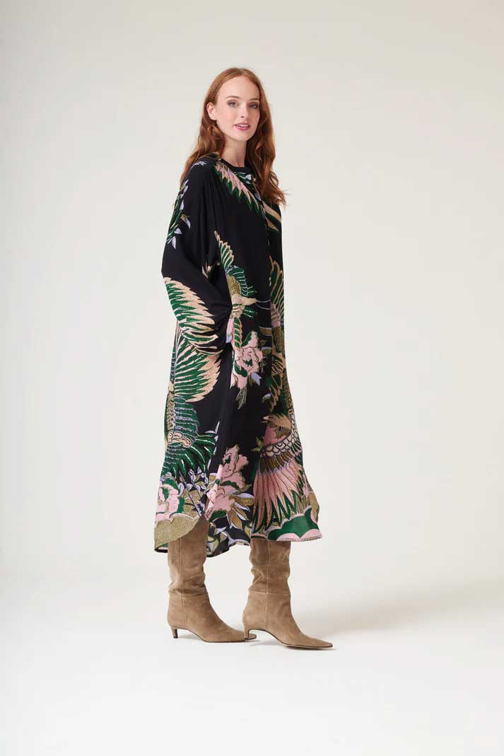 These large, graceful cranes in sand, pink and emerald, green fly across this ‘nearly black’ base.