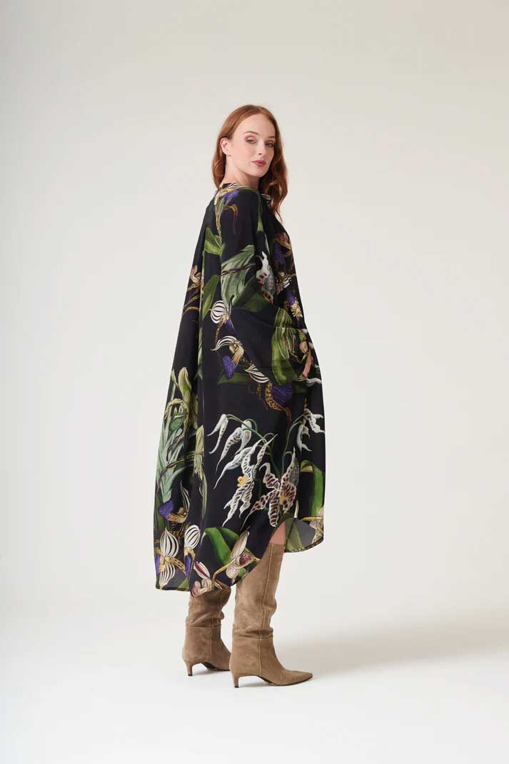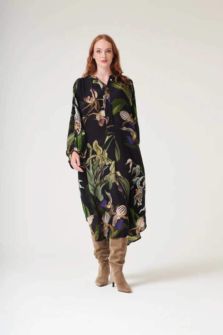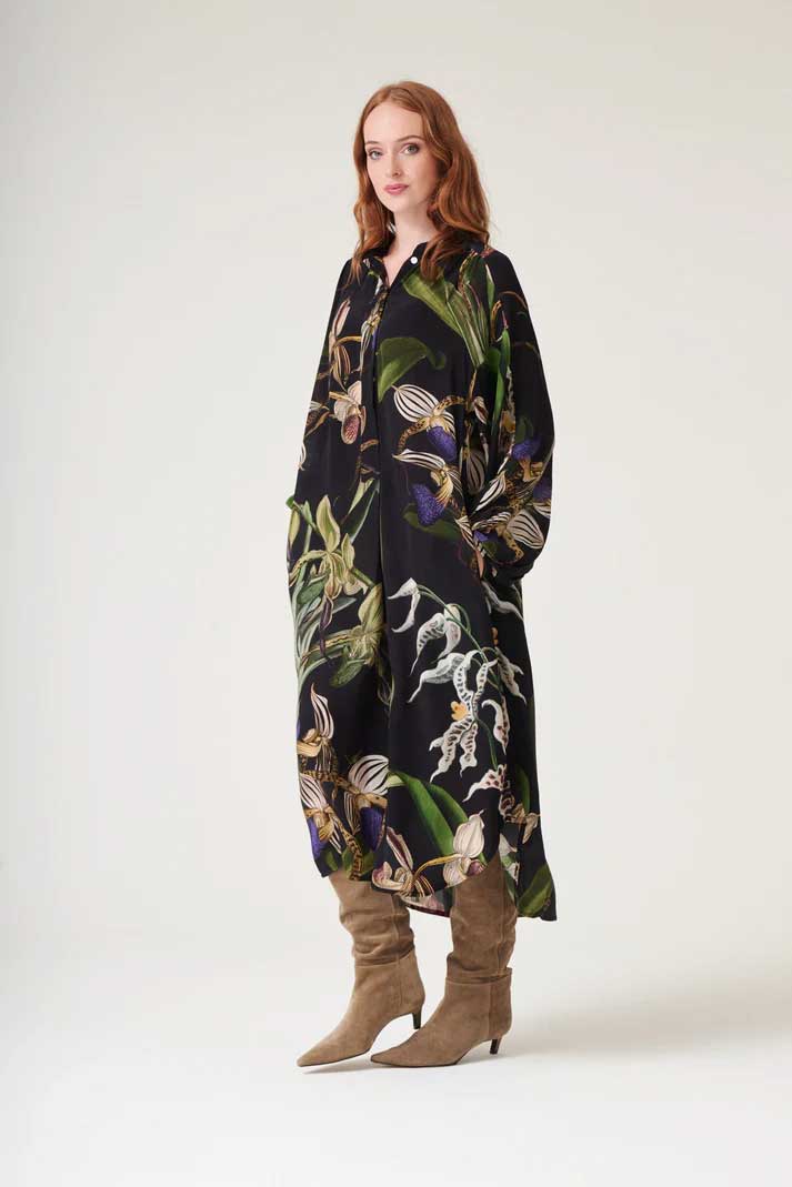 Our crepe Darcy dress features a flattering mandarin collar with a concealed placket front, pockets and loose-fitting balloon sleeves. Our mid-length dress is half lined in organic cotton for ultimate comfort.