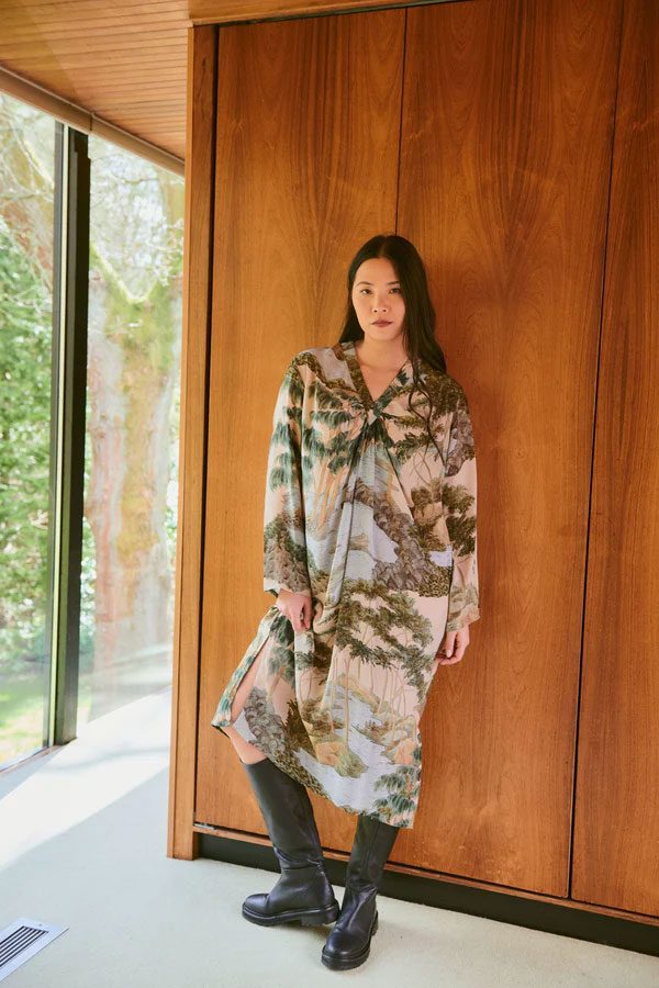 Our crepe Midi dress is an effortless wear for the autumn winter season. Featuring a V-neckline with gentle gathering, long sleeves, and half lined in organic cotton.