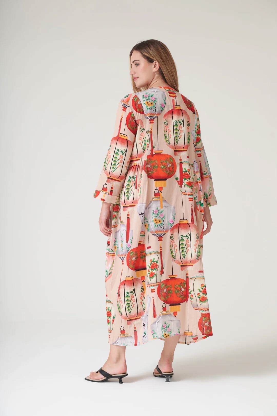 With its delicately pleated placket top leading down to a flowing maxi skirt, this dress showcases the entire One Hundred Stars signature print.