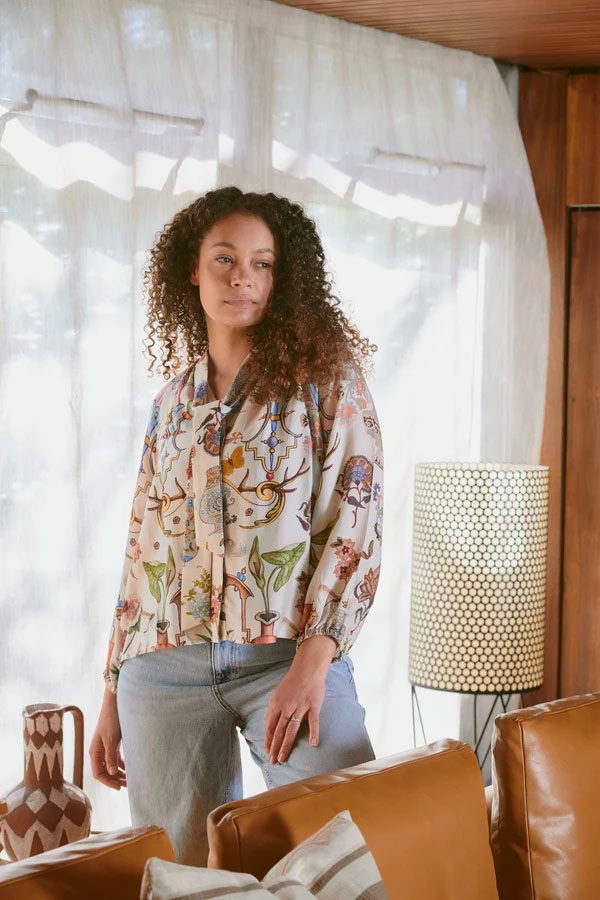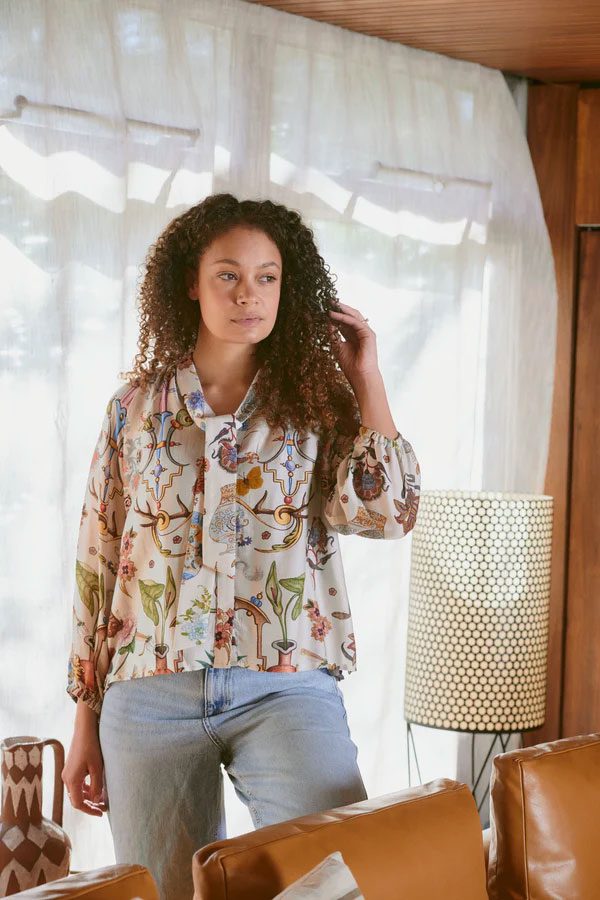 This classic shape blouse shows our prints beautifully. The Pussy-bow can be teamed with our A line skirt for a more formal look or worn or simply as a casual blouse.