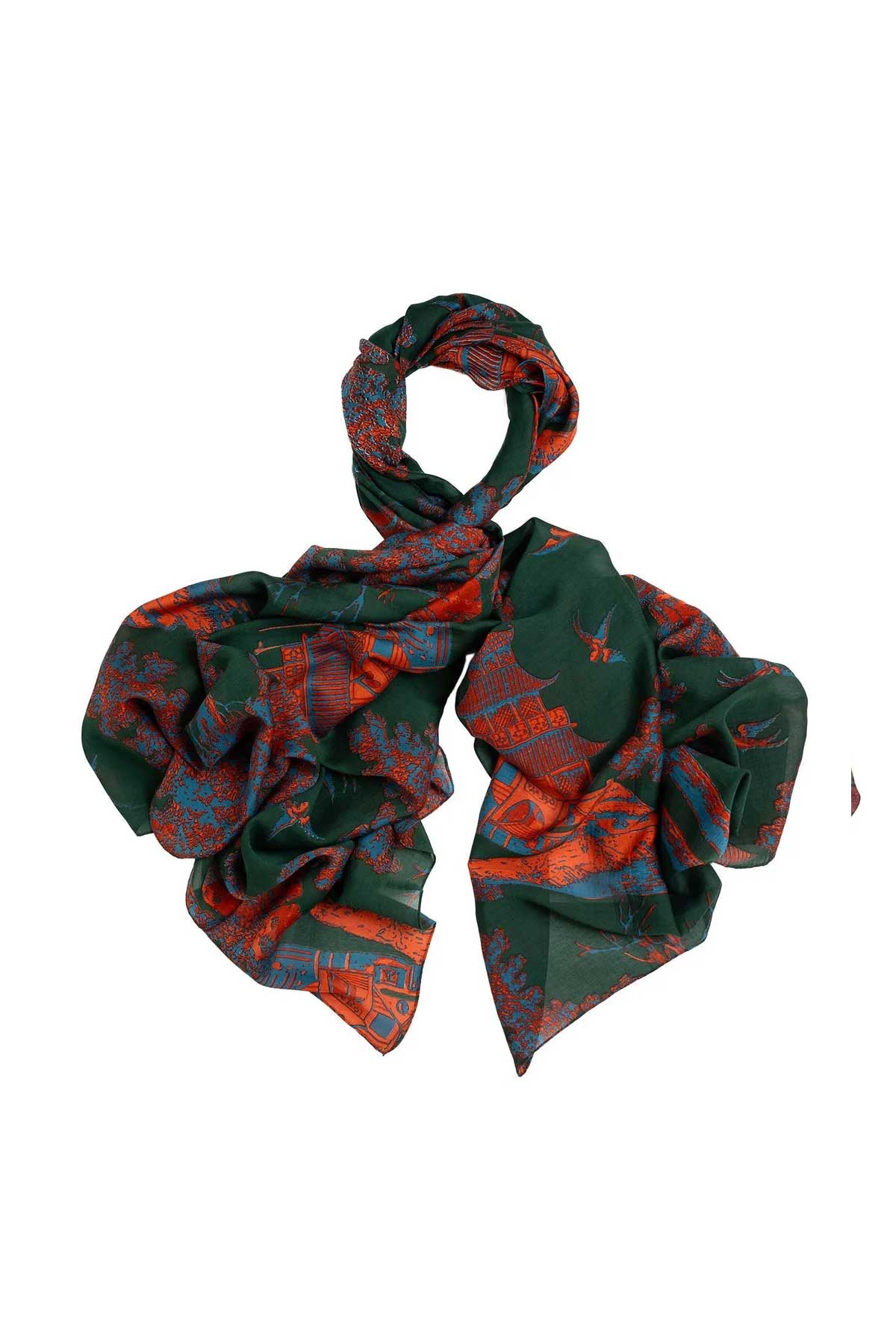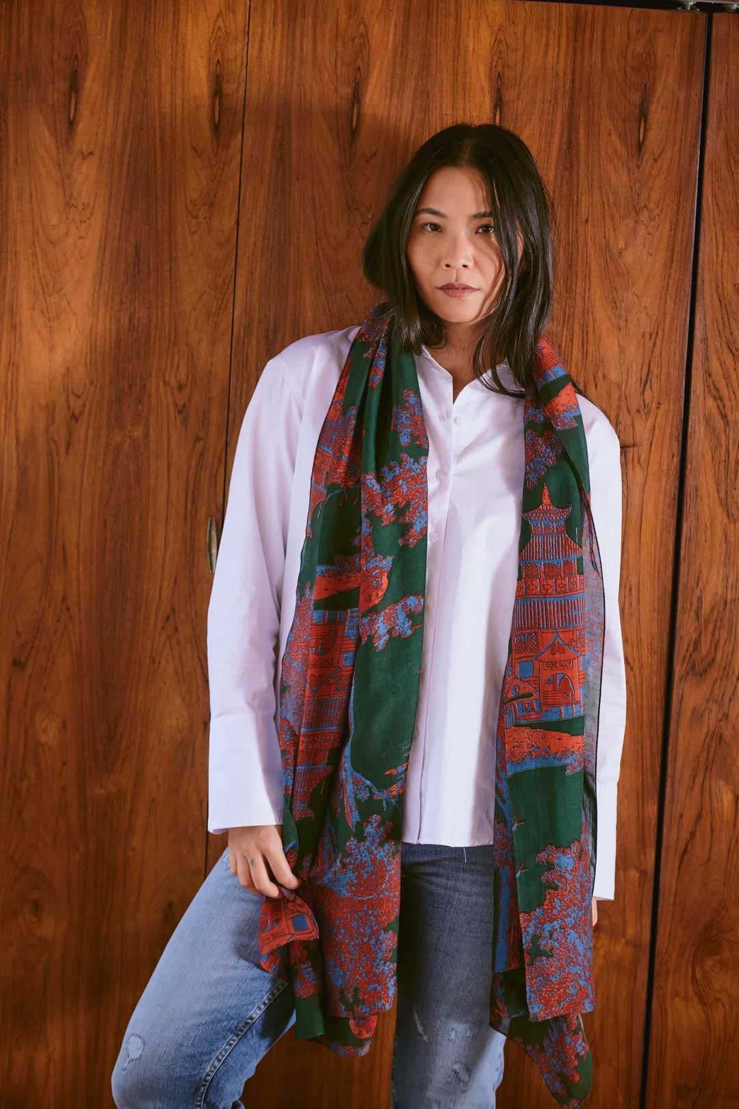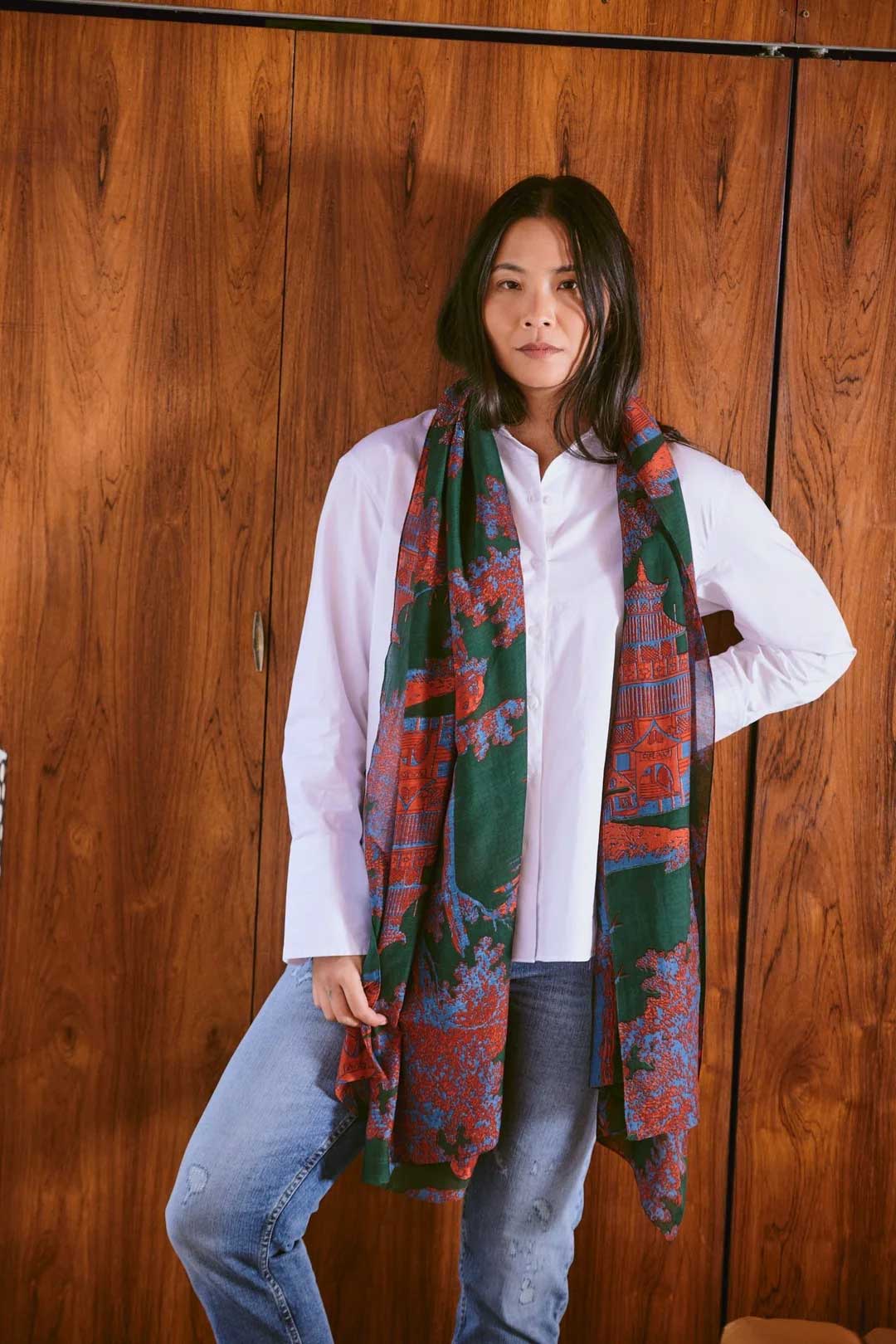 Giant pagoda and trees with a mirror image. A forest green base with blues and a dash of fluorescent orange makes this quirky design pop.