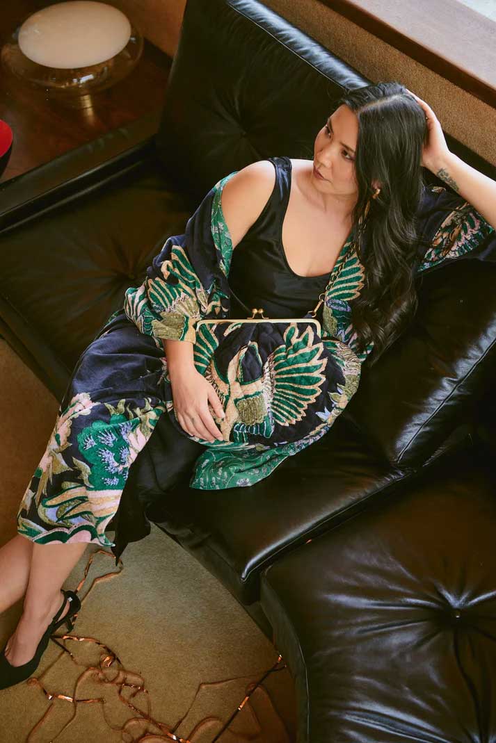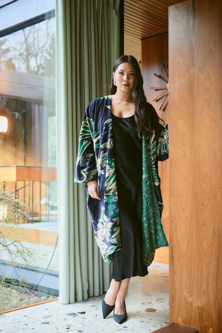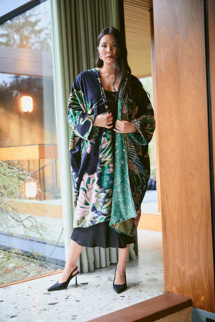 A luxury statement piece showing the full beauty of our bold signature designs. Made from soft cotton velvet with a complimentary printed lining, loose-fit sleeves, and hidden side pockets.