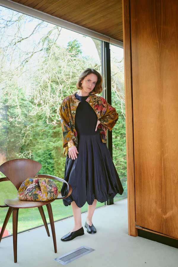 A beautiful soft, short velvet jacket. With a mandarin collar, patch pockets, mother of pearl buttons, and loose-fitting ¾-length sleeves, this jacket will be a staple piece to take you through the cooler months.