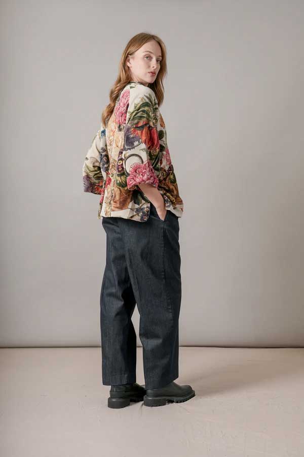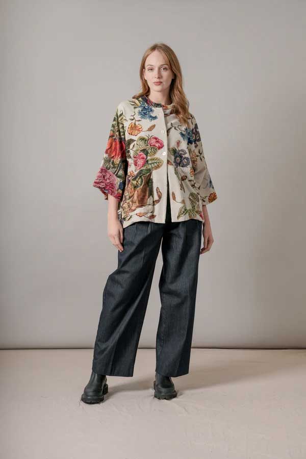 Brand new this season. A beautiful soft, short velvet jacket. With a mandarin collar, patch pockets, mother of pearl buttons, and loose-fitting ¾-length sleeves, this jacket will be a staple piece to take you through the cooler months.