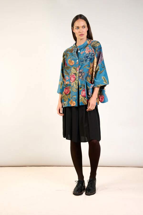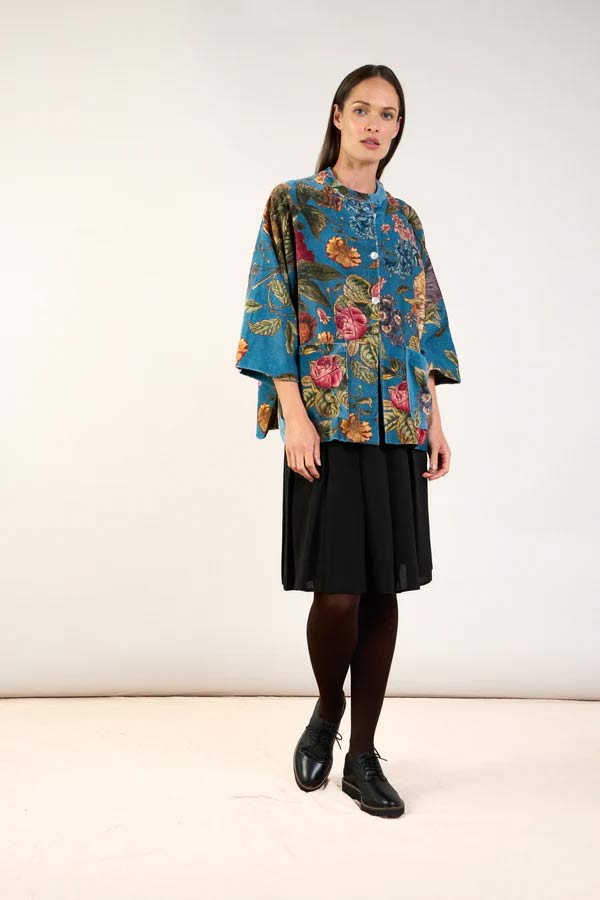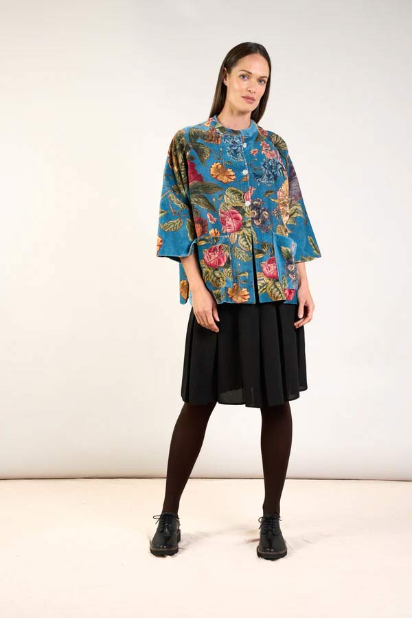 Brand new this season. A beautiful soft, short velvet jacket. With a mandarin collar, patch pockets, mother of pearl buttons, and loose-fitting ¾-length sleeves, this jacket will be a staple piece to take you through the cooler months.