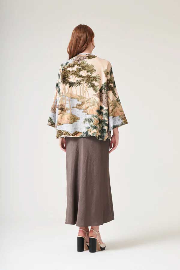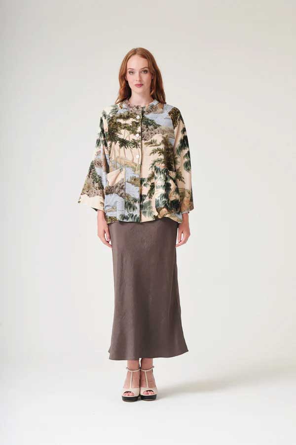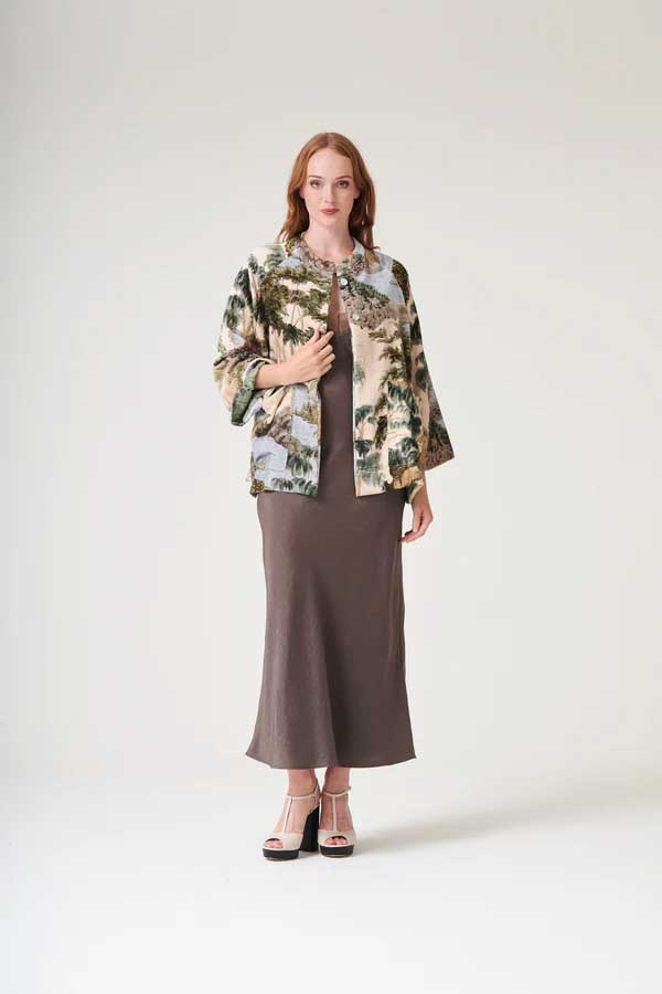 A beautiful soft, short velvet jacket. With a mandarin collar, patch pockets, mother of pearl buttons, and loose-fitting ¾-length sleeves, this jacket will be a staple piece to take you through the cooler months.