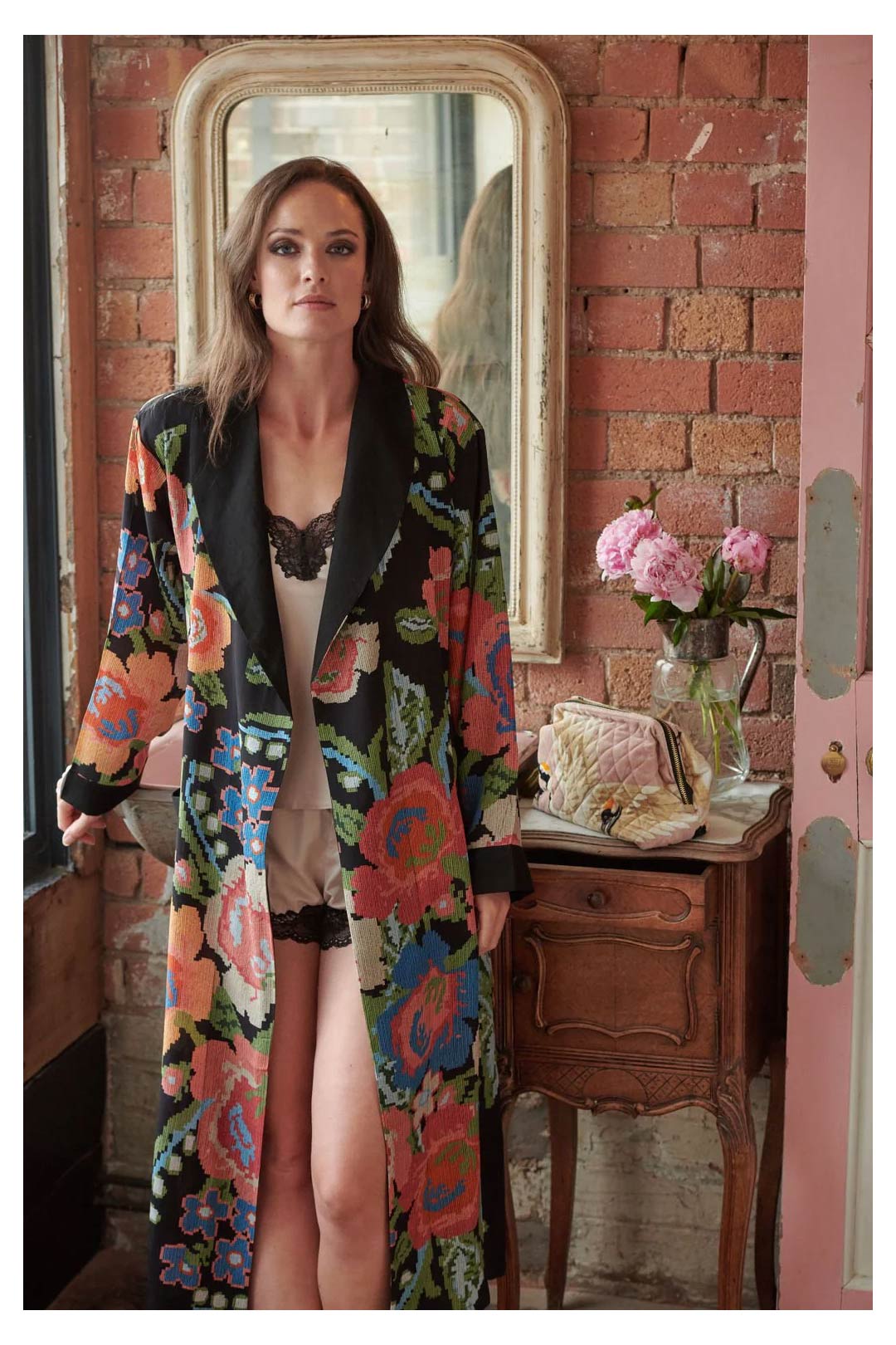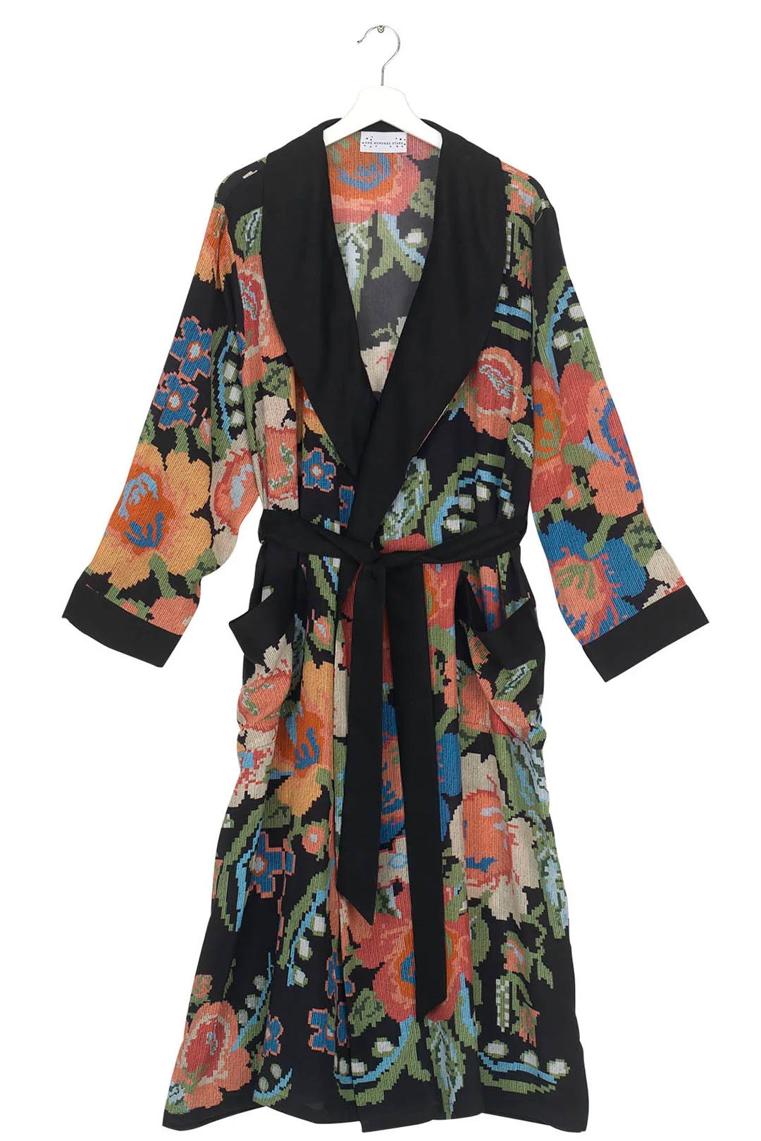 This design falls to an elegant long length and features a fold over collar, complete with self-tie waist belt and front patch pockets. This gown is perfect as a luxurious house coat or for layering as a chic accessory to your favourite outfit.
