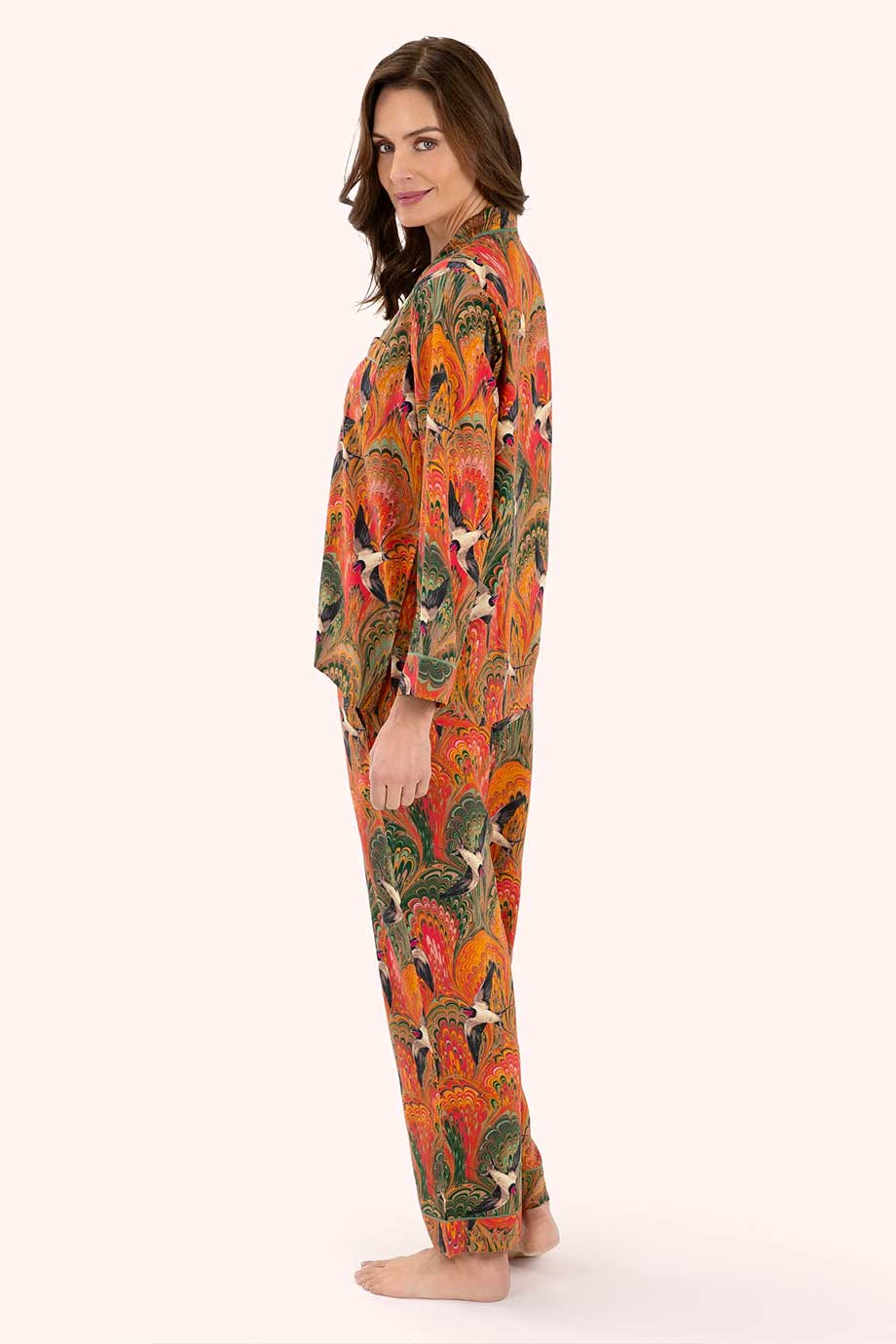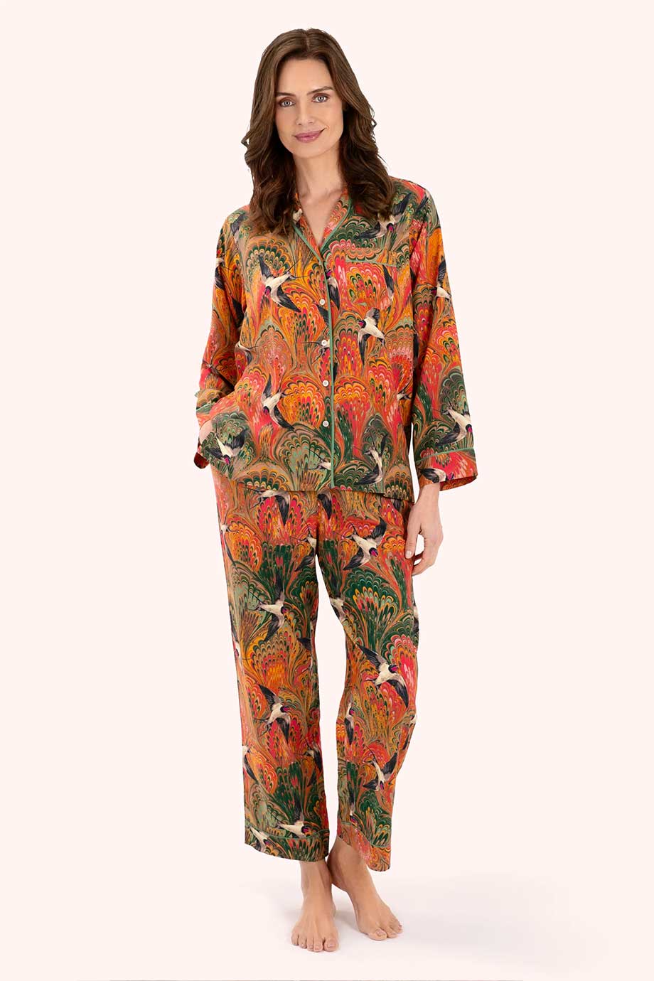 Long and luxurious, our Powder PJs make an ideal gift for a loved one or winter warmer for yourself this season. An oversized fit means the ultimate comfort can be combined with unique style this season. This Marbled Swallows design combines two prints in one for a psychedelic Autumnal treat!