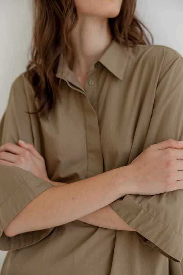HARI is a relaxed shirt dress in our basic collection of organic cotton. The dress has collar, half button placket with hidden buttons and long sleeves. The sleeves are three quarter length. The dress has pockets in front seams and has an airy and comfy fit for everyday wear.