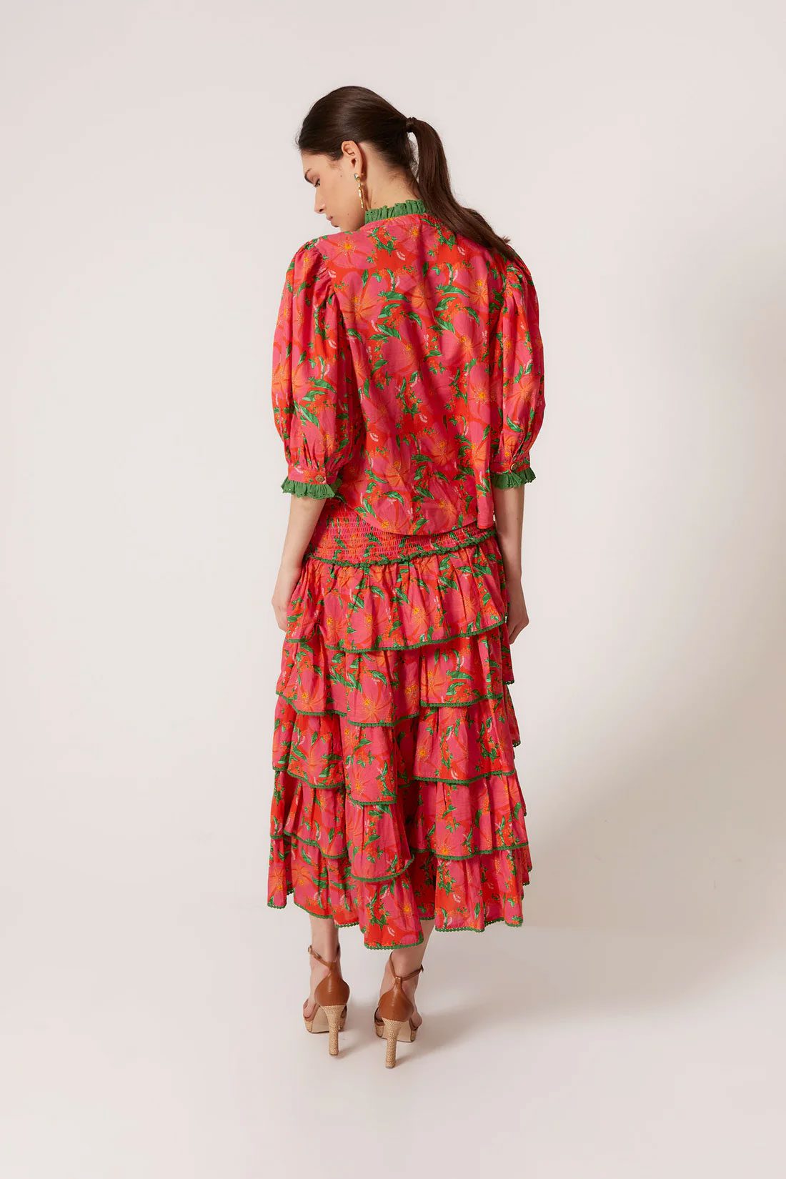 Coosy midi skirt with five tiered ruffles trimmed with green ruffles. A cheerful, romantic, and sophisticated look, ideal for special events or summer looks with personality.