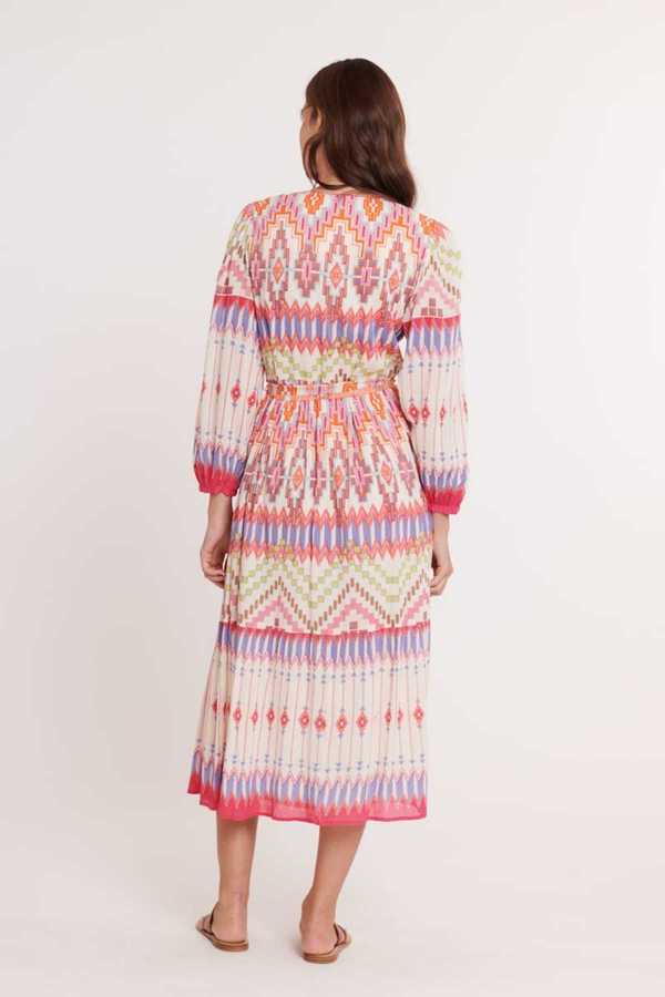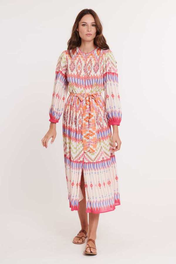 Long dress in printed viscose. Round neck fully buttoned at center front with shell buttons. Solid piping at neck and front opening. Self-fabric belt. Embroidery stitch at cuff. Fully lined with cotton voile except sleeves.
