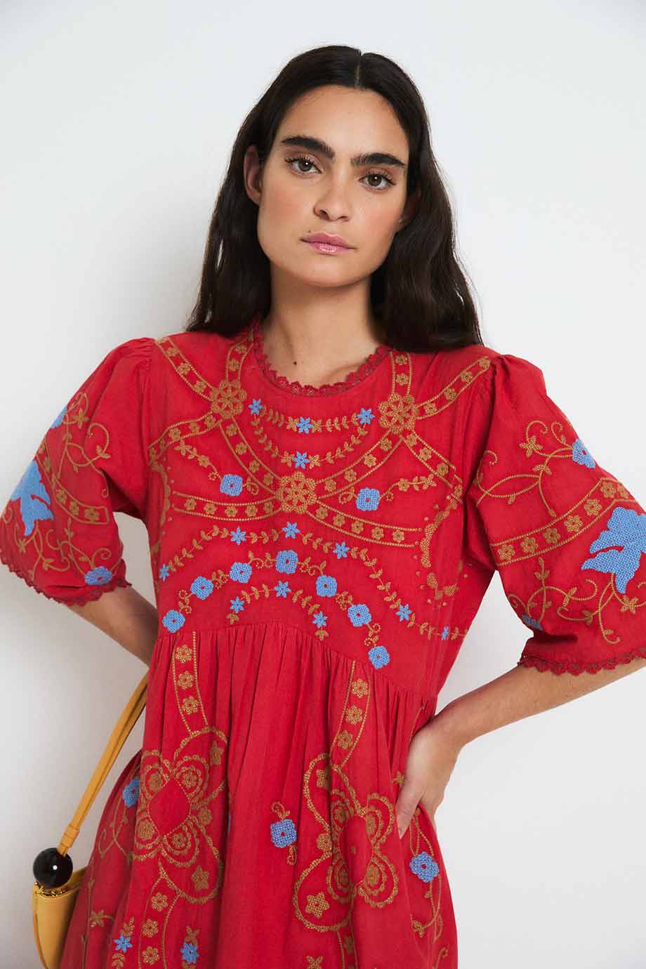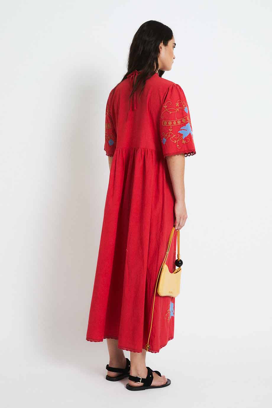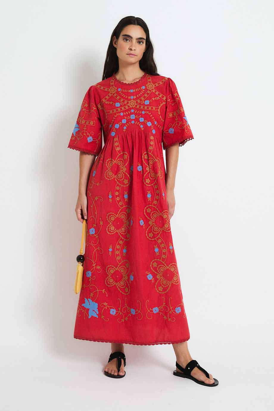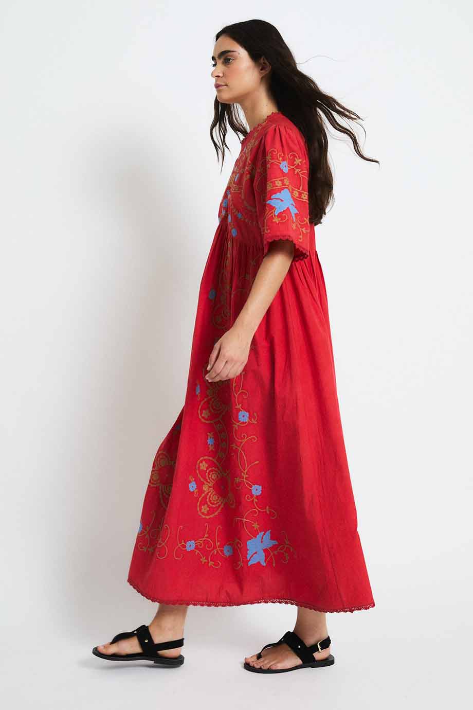 Red midi dress with contrasting floral embroidery. It features a round neckline, short wide sleeves, and a cut below the bust that creates a flowing and comfortable silhouette. Decorative embroidery adorns the chest, sleeves, and skirt.