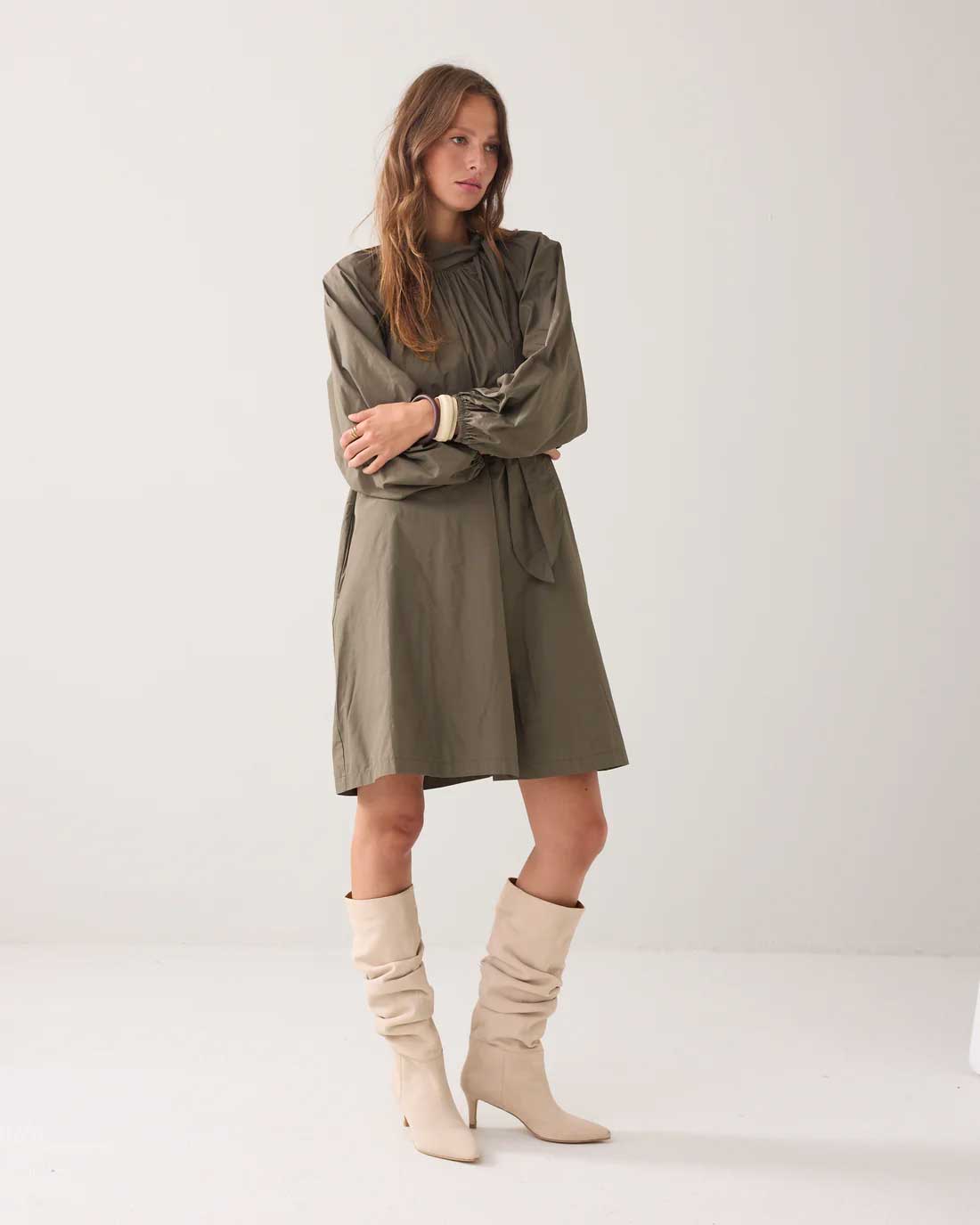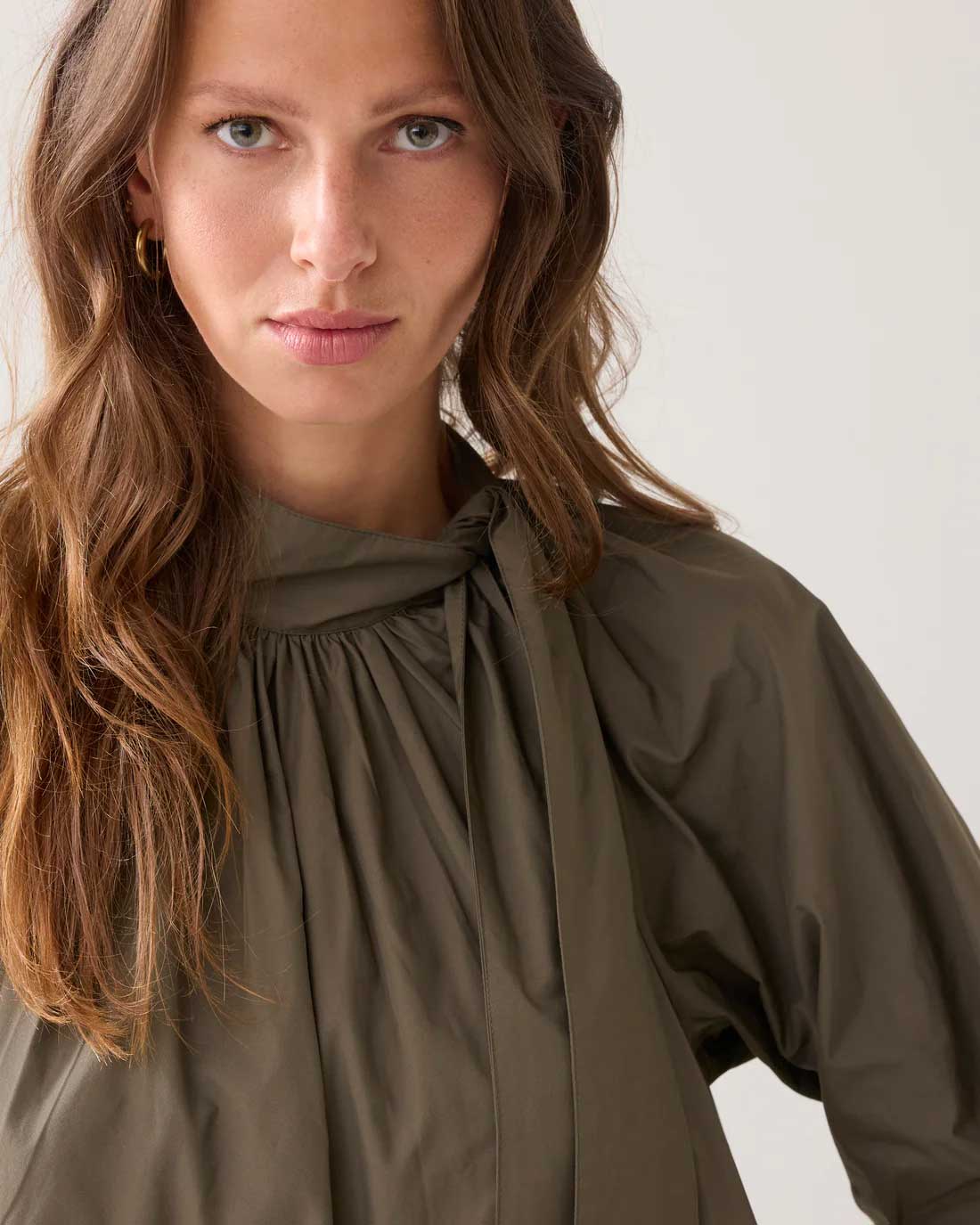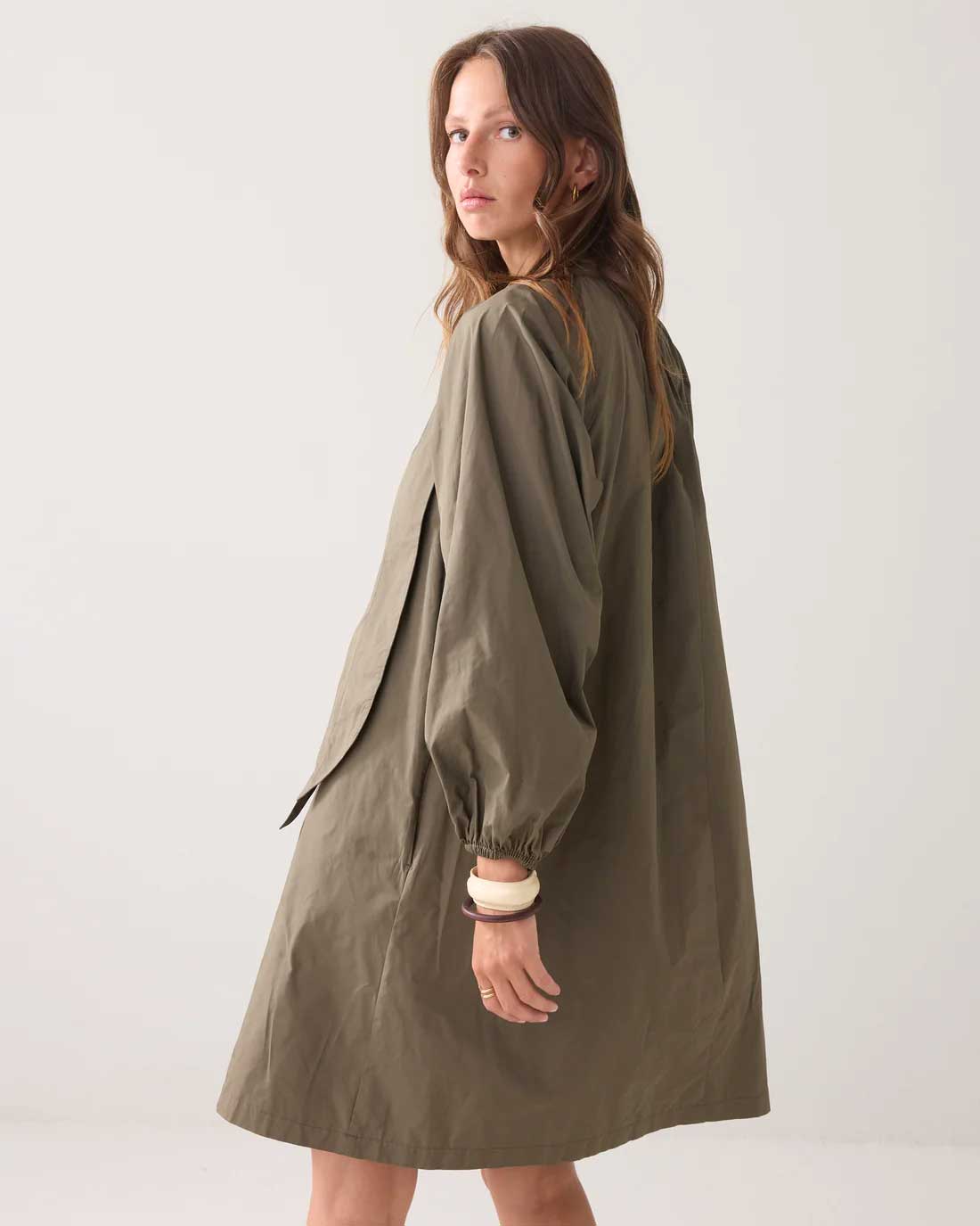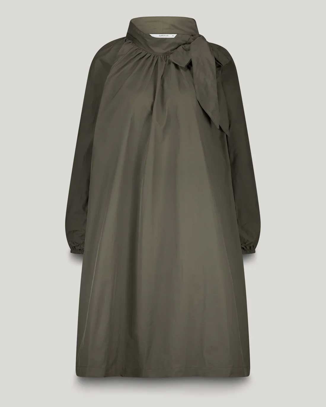 Cool A-line dress in a sturdy taffeta fabric with raglan sleeves and a bow detail at the neckline. The dress falls just above the knee and has pockets in the side seam.