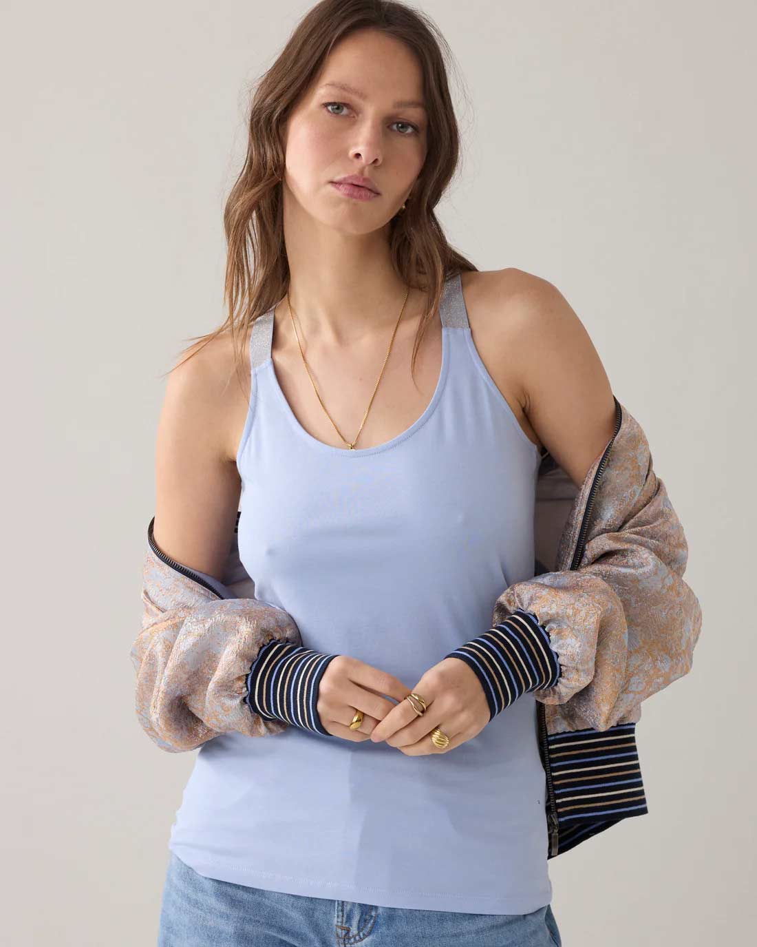 Basic singlet with a cross band at the back, made of cotton elastane jersey fabric. This slim-fit top has eye-catching glittery straps.