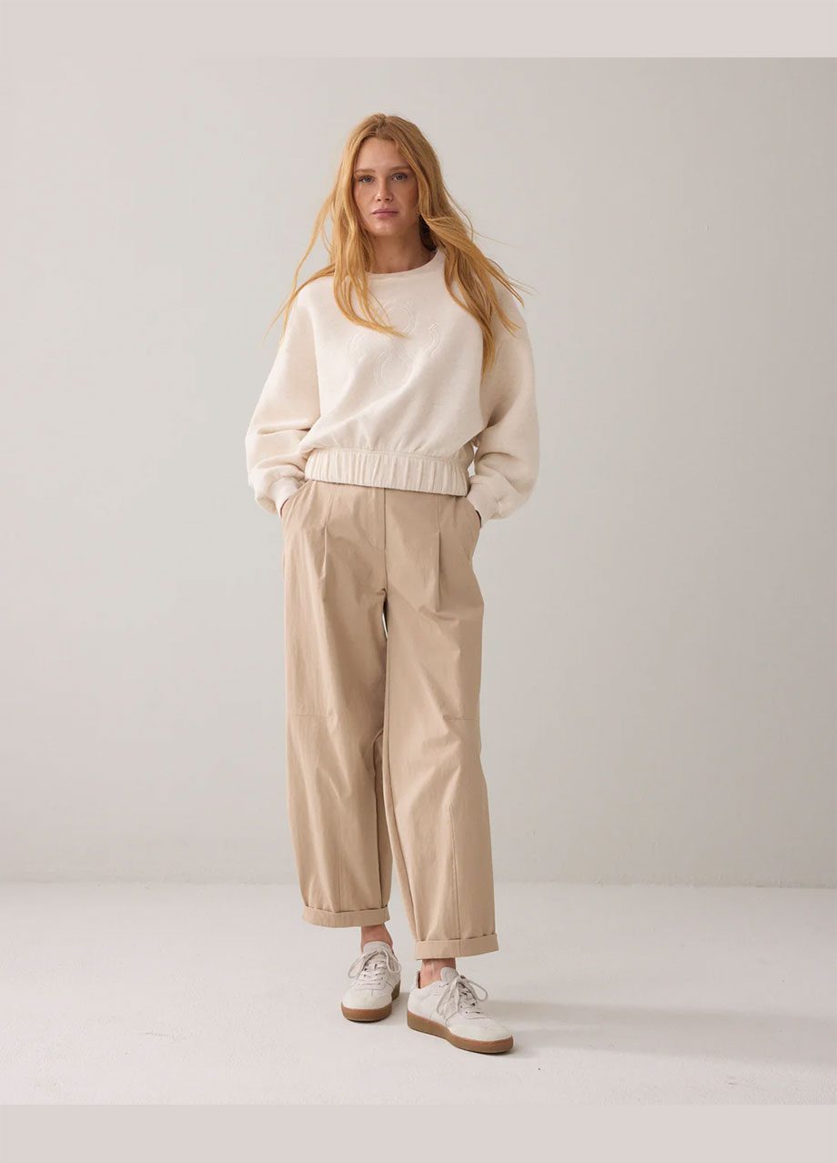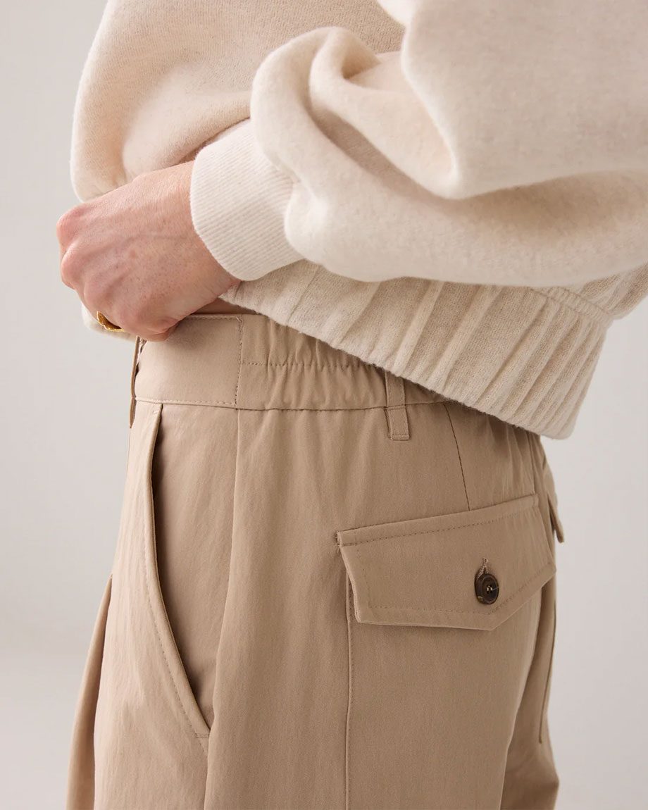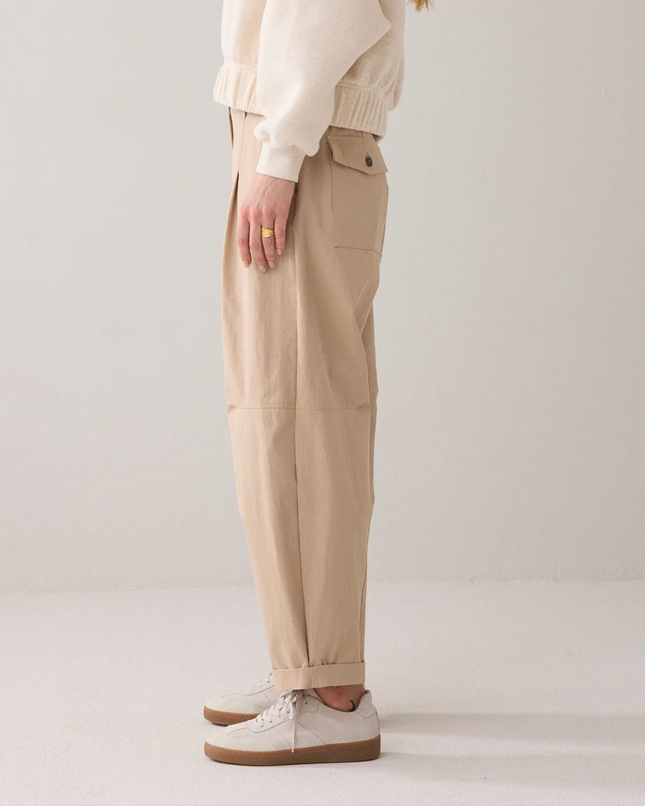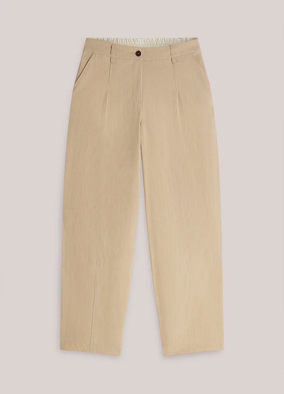 Trousers in a cotton blend with a soft sheen and comfortable cocoon fit. The trousers have darts at the bottom and sides and a brown button fastening.