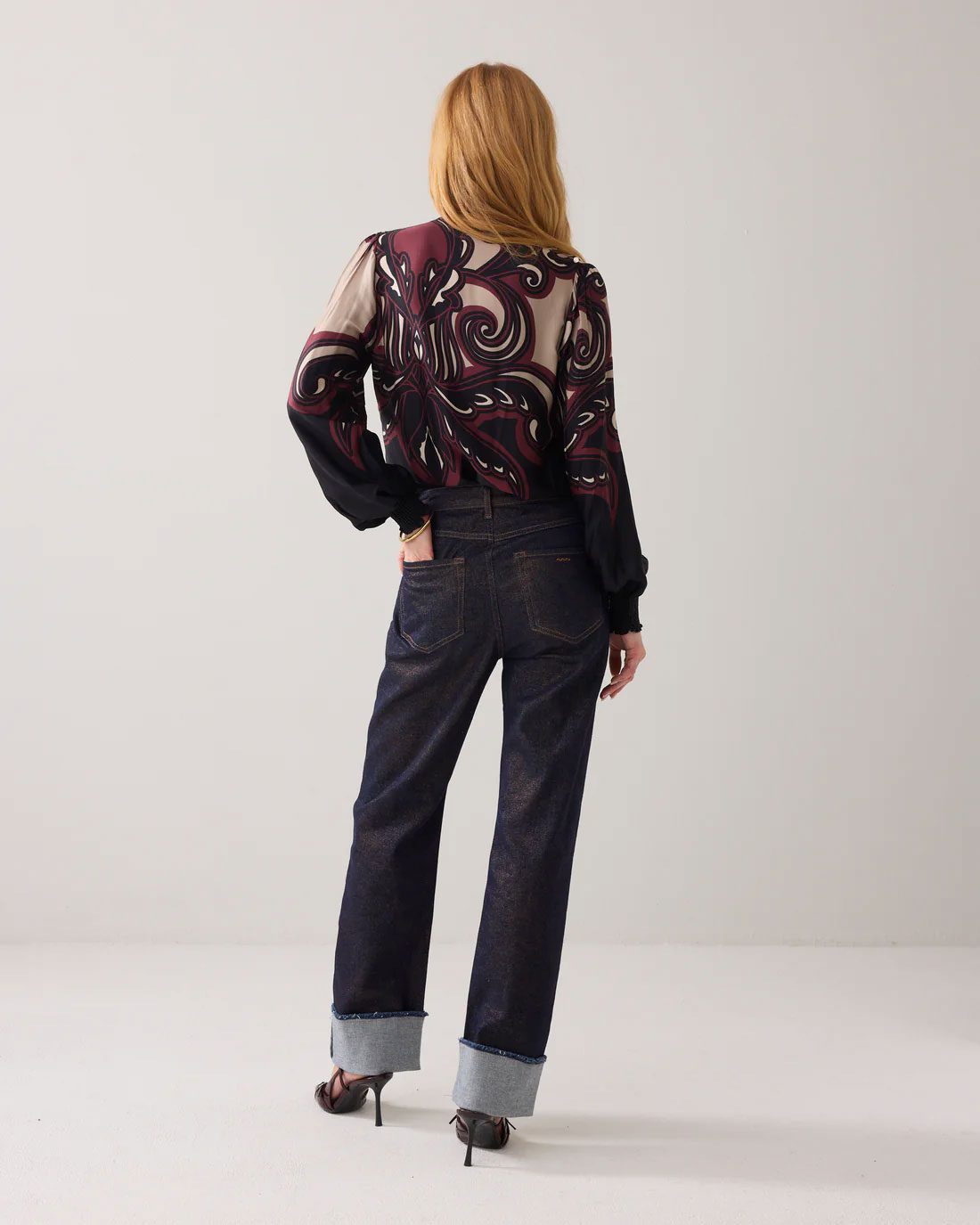 Straight fit Sarin jeans made from stretch denim with foil coating with a mid-rise waist. The trousers have a wide turned-up hem and a raw edge trim.