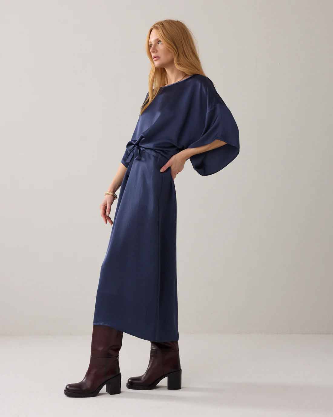 Dress in loose-fitting heavy silky fabric with a slight sheen. The dress has a boat neckline with hemmed trim, wide straight sleeves with a lowered shoulder seam and a gathered waist with cord tie in a tunnel.