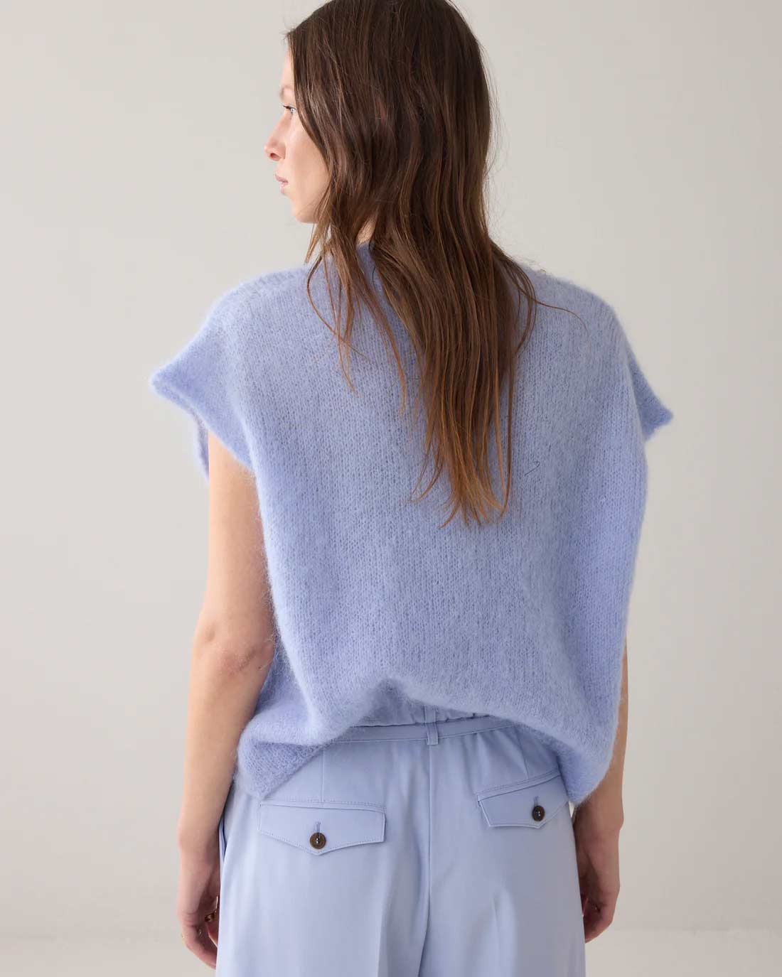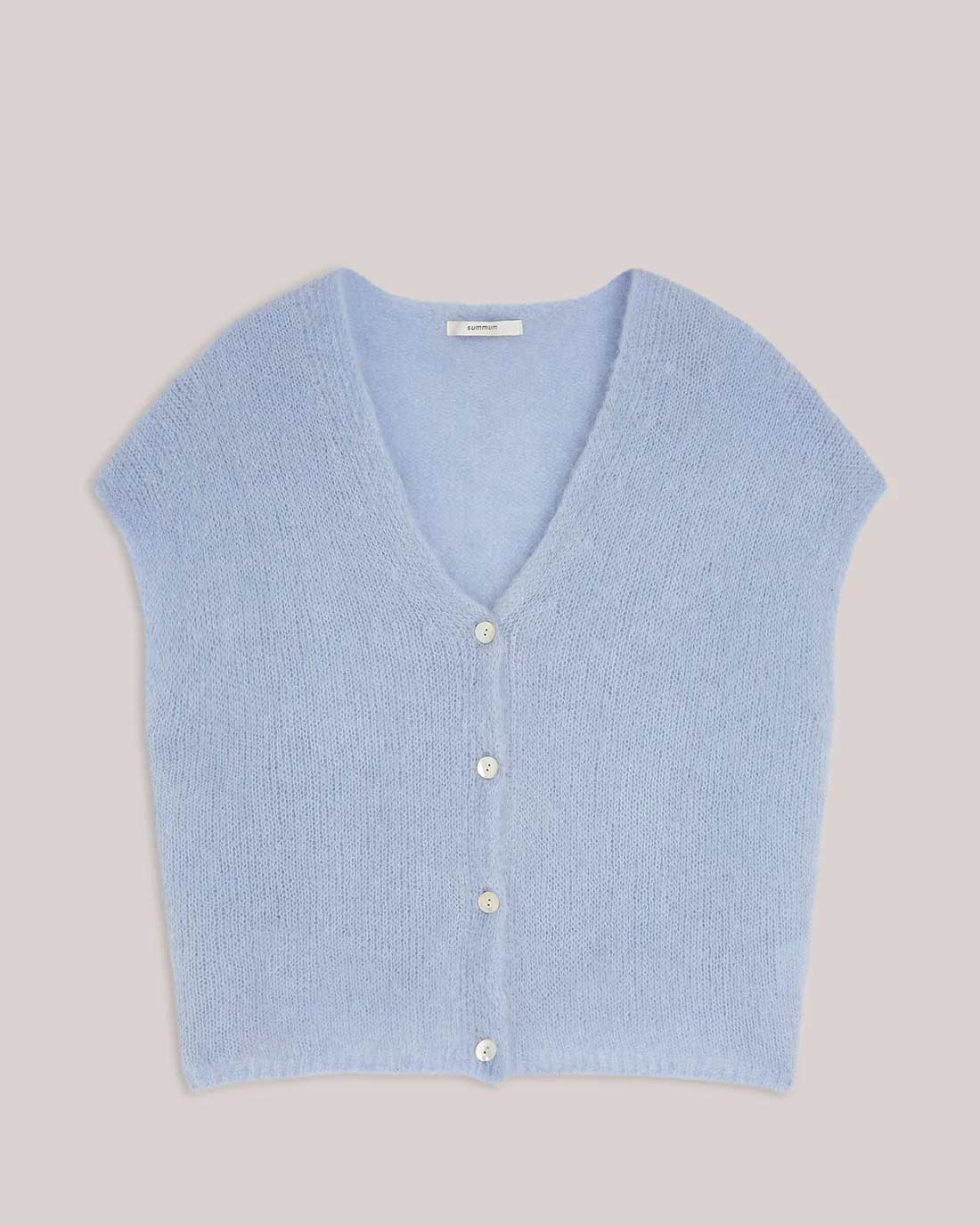 Luxurious spencer in a soft luxurious mohair blend with a slightly oversized fit. The spencer has short sleeves, mother-of-pearl buttons and an airy texture. Pairs nicely with a blouse or Blue Daze denim.
