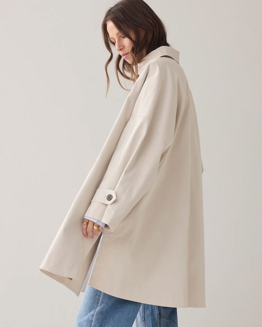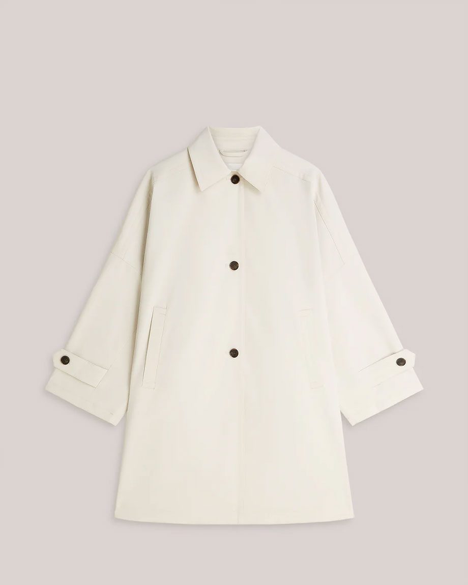 Long oversized coat – grandpa coat – with lowered shoulder seam and side slits. The jacket is lined and has a button fastening, adjustable button cuffs and slit pockets.