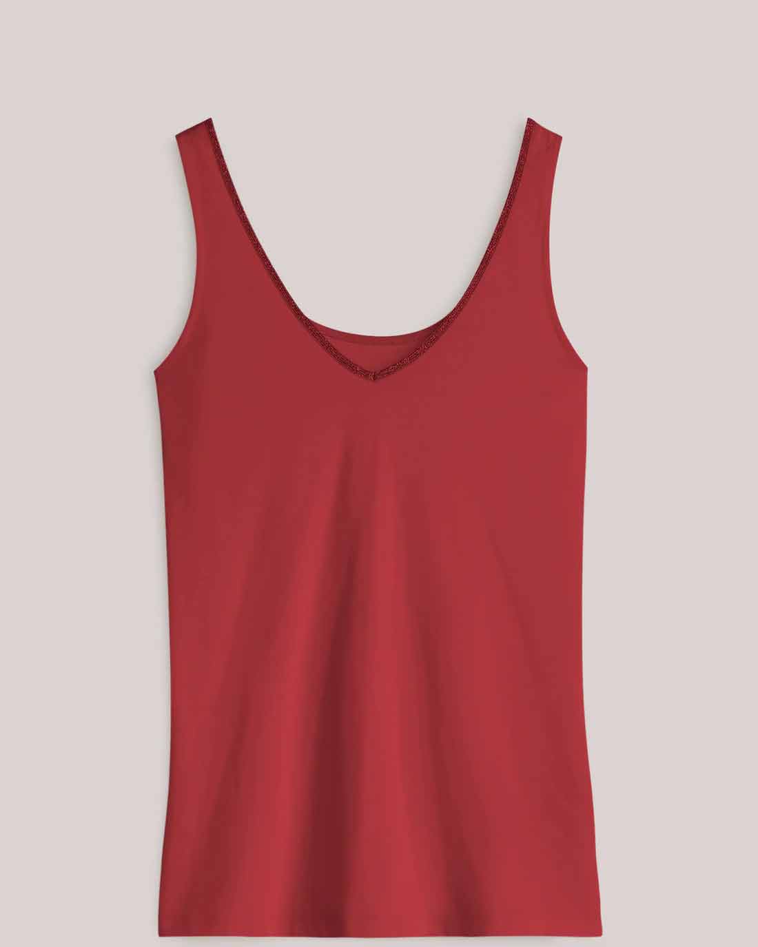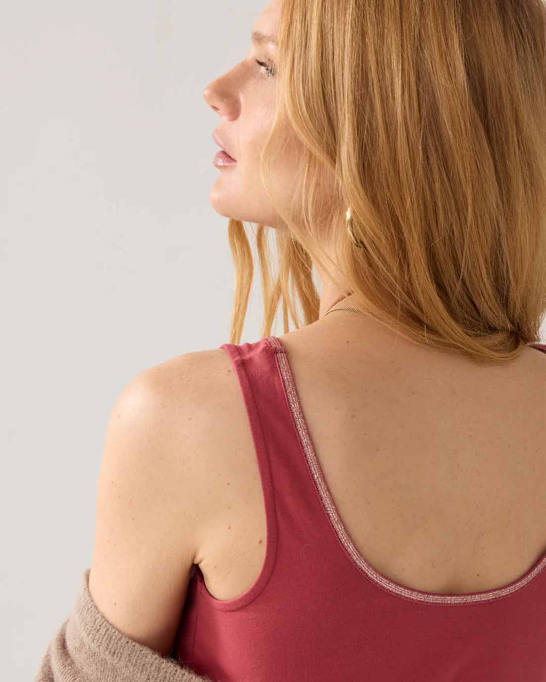 Basic singlet with a feminine fit, in a soft stretch fabric. The top is reversible and has a U-neck on one side and a V-neck on the other. A delicate glitter trim runs along the neckline.