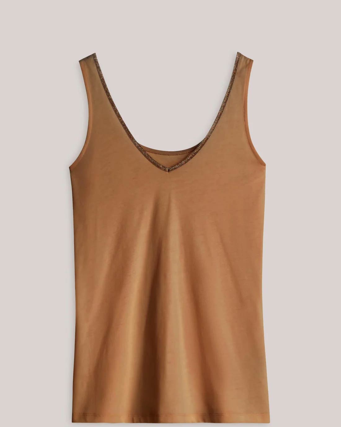 Basic singlet with a feminine fit, in a soft stretch fabric. The top is reversible and has a U-neck on one side and a V-neck on the other. A delicate glitter trim runs along the neckline.