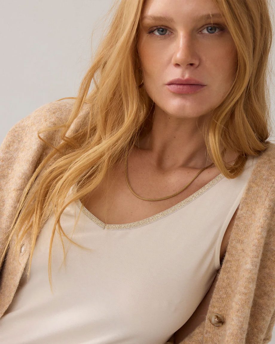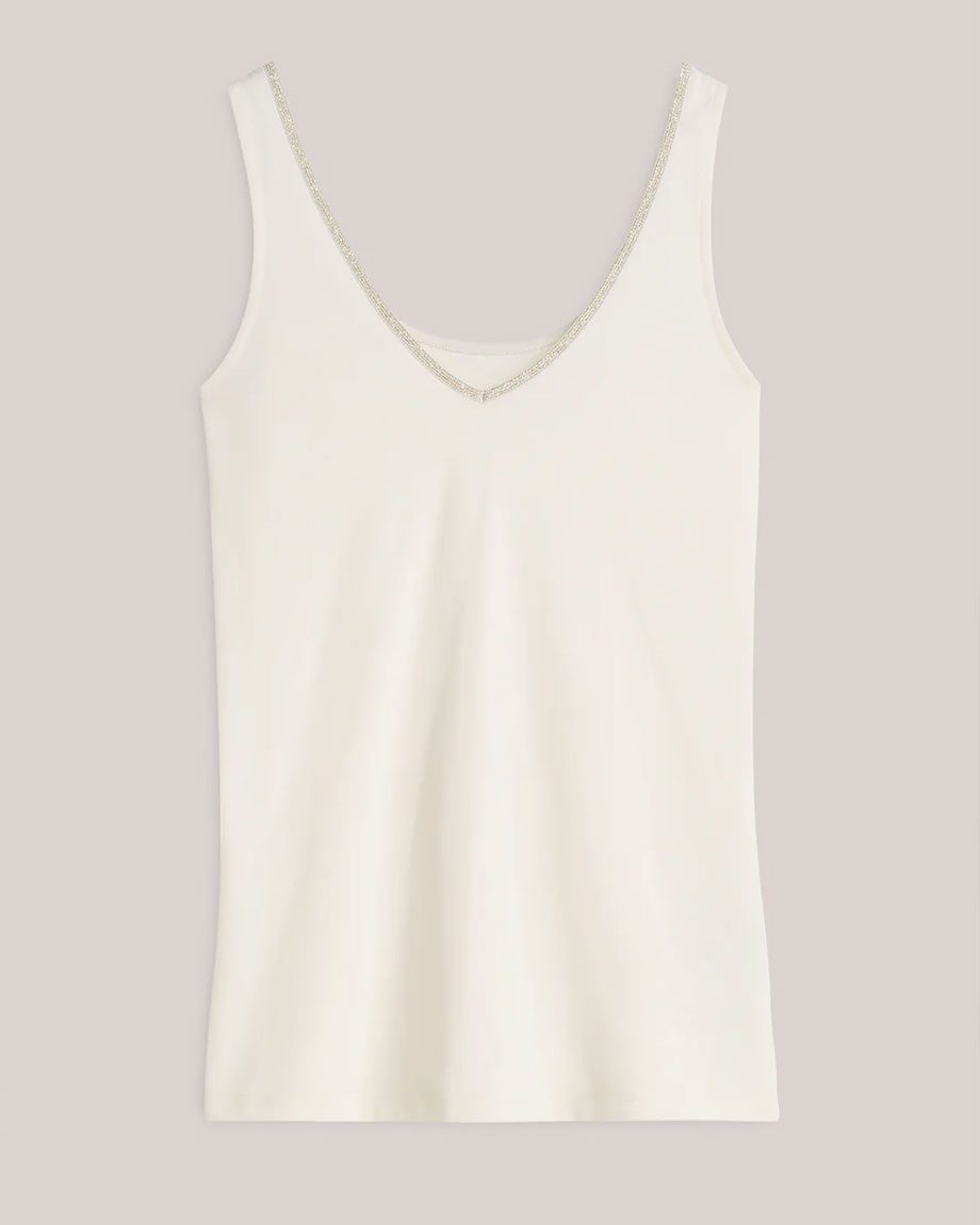 Basic singlet with a femininee fit, in a soft stretch fabric. The top is reversible and has a U-neck on one side and a V-neck on the other. A delicate glitter trim runs along the neckline.