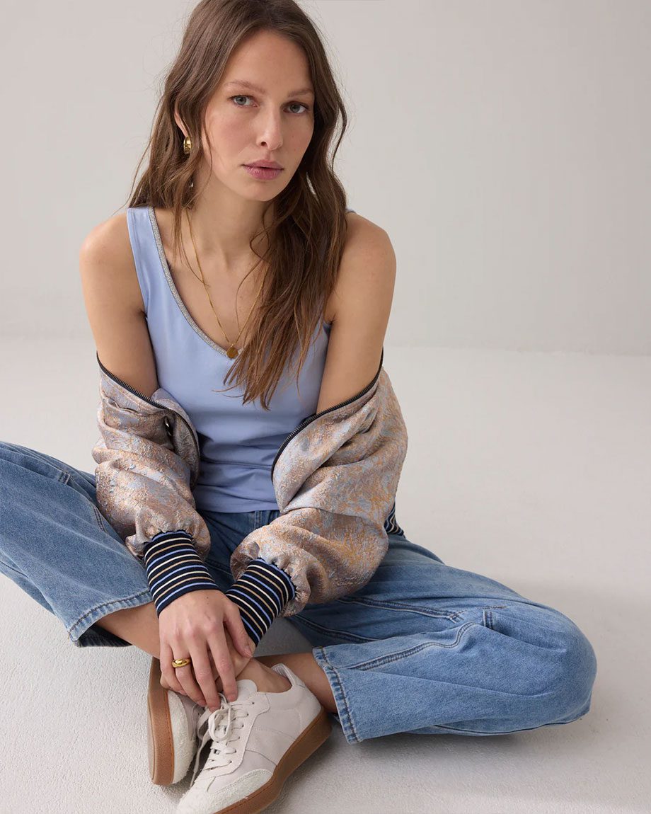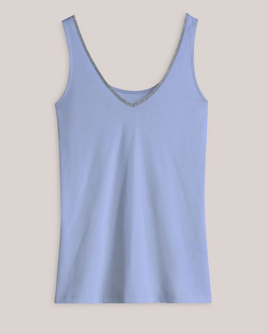 Basic singlet with a femininee fit, in a soft stretch fabric. The top is reversible and has a U-neck on one side and a V-neck on the other. A delicate glitter trim runs along the neckline.