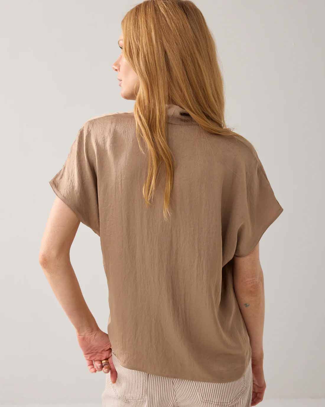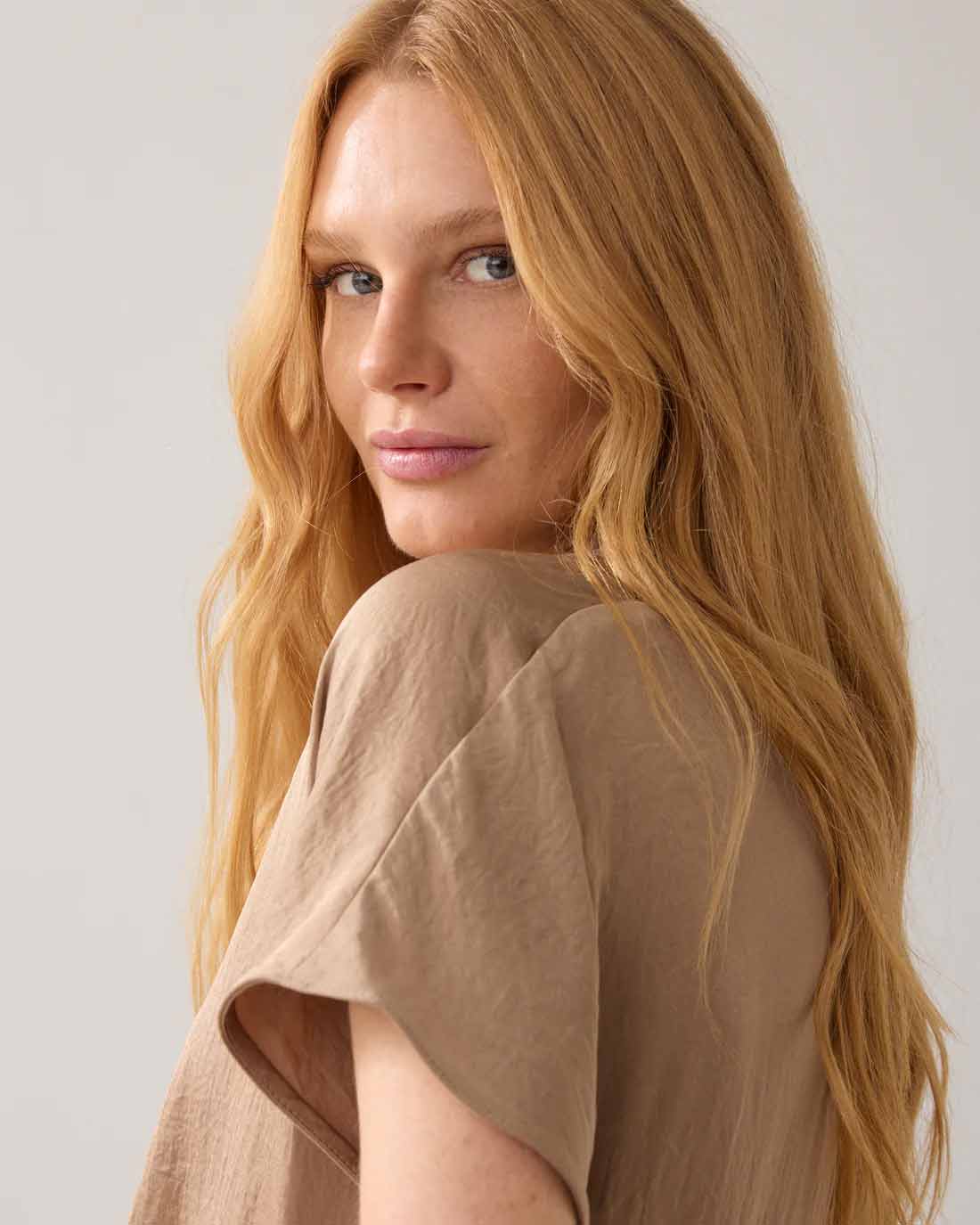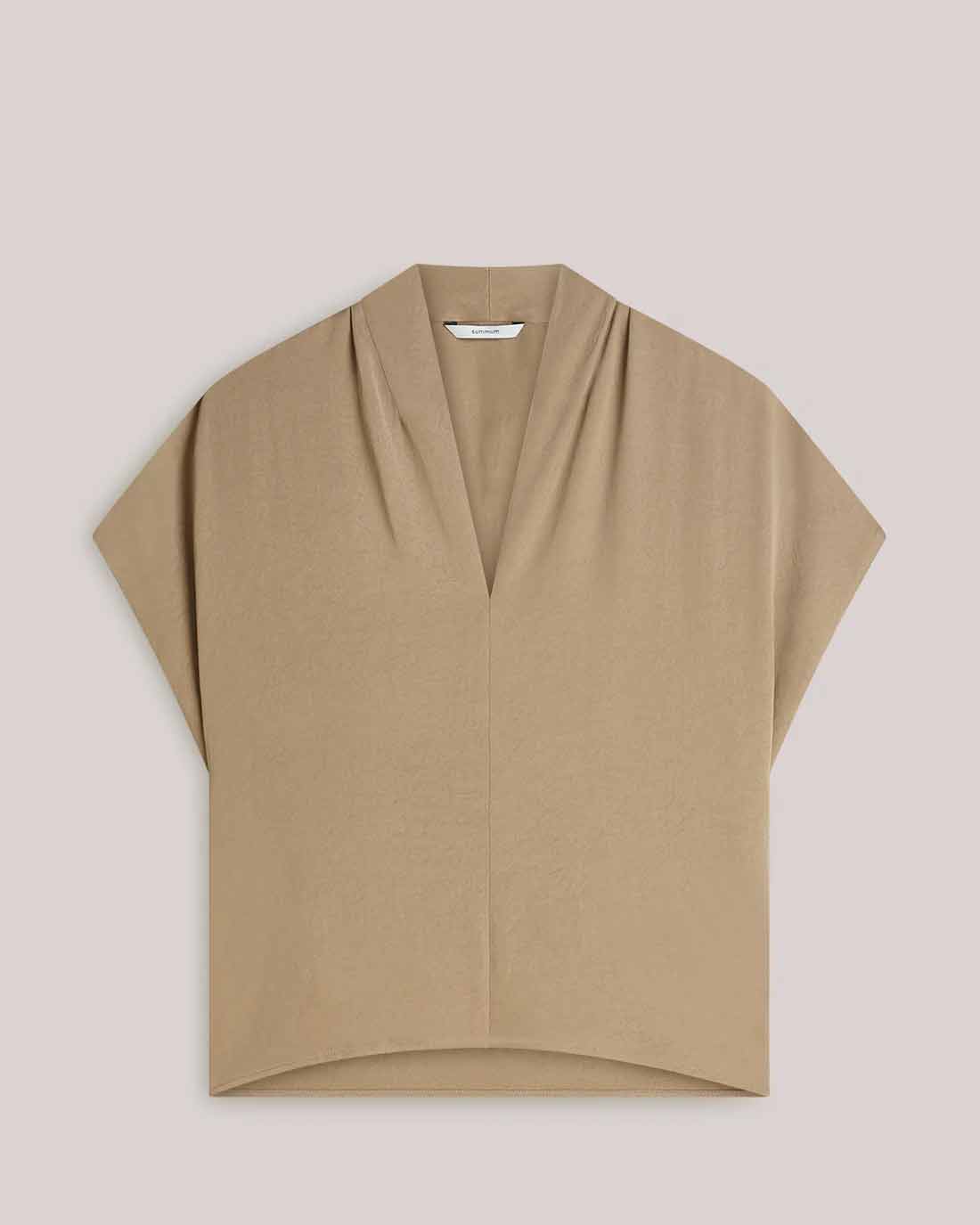 Loose-fitting top with a V-neck and a subtle seam at the centre front. The top has a finely cropped cap sleeve for a flattering effect.