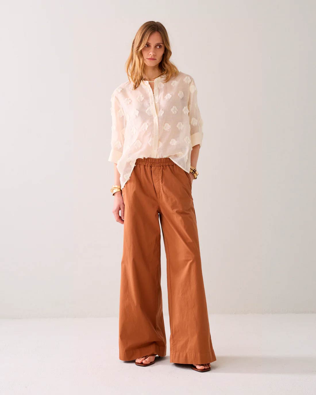 Trousers made of extra-soft cotton with mega-wide legs. The trousers have a high waist with elasticated waistband and inset pockets in the side seam.