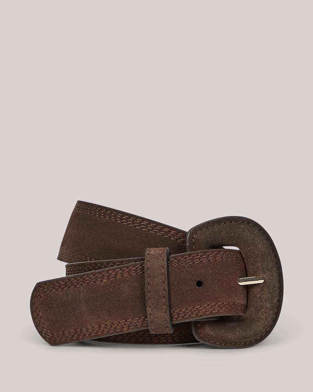 Leather belt with an eye-catching suede-covered buckle.