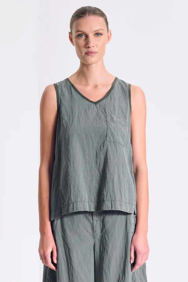 Comfort-fit silk-blend tank top with ribbed knit collar and armholes. Breast pocket. The hem is shorter at the front than at the back. Garment dyed.